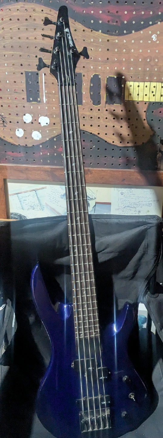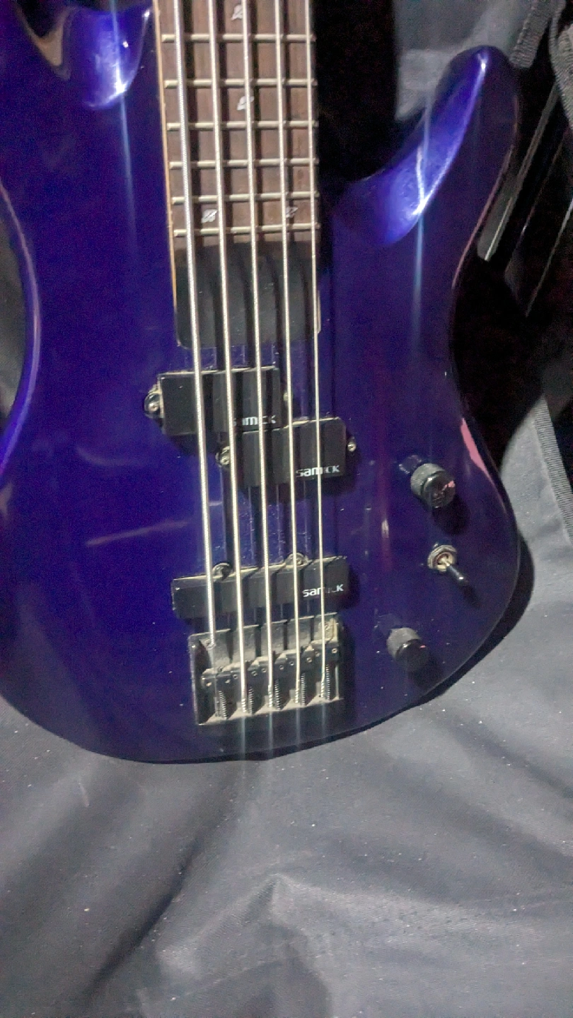 Selling a Samick 5-string bass guitar in a cool blue colour! It comes with a case to keep it safe and sound. Perfect for anyone looking to upgrade their instrument or start playing!