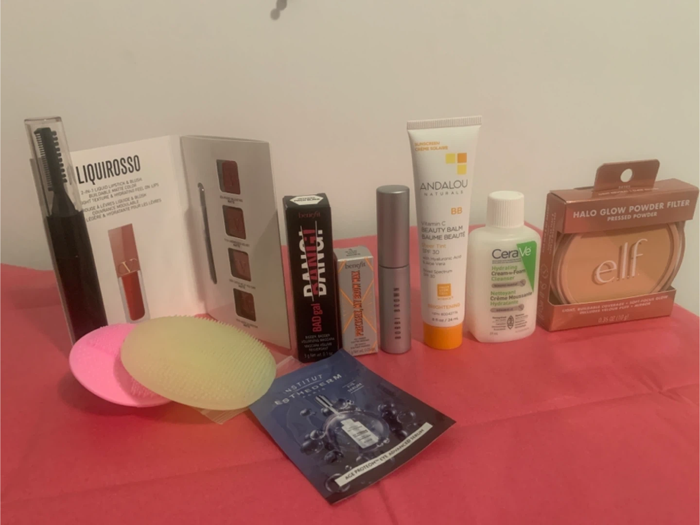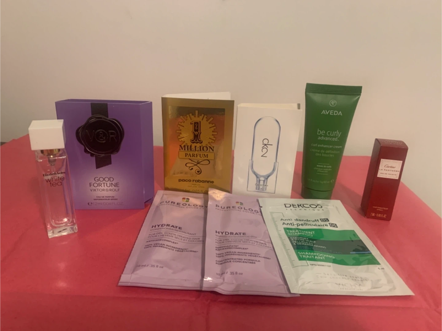 Items Pictured/bag is provided: Elf Glow powder Andalou Sunscreen BB Balm- Tested once on clean skin CeraVe cleansing Foam 2 silicone face scrub Valentino Lip & Blush sample Benefit Brow wax sample 2 mascara Samples 2 nail files Eye serum sample ELF eyebrow laminate Gel 4 hair samples 5 fragrance samples 3 travel sprays Everything for $15 cash Pickup 30 Okra Tomar Crescent