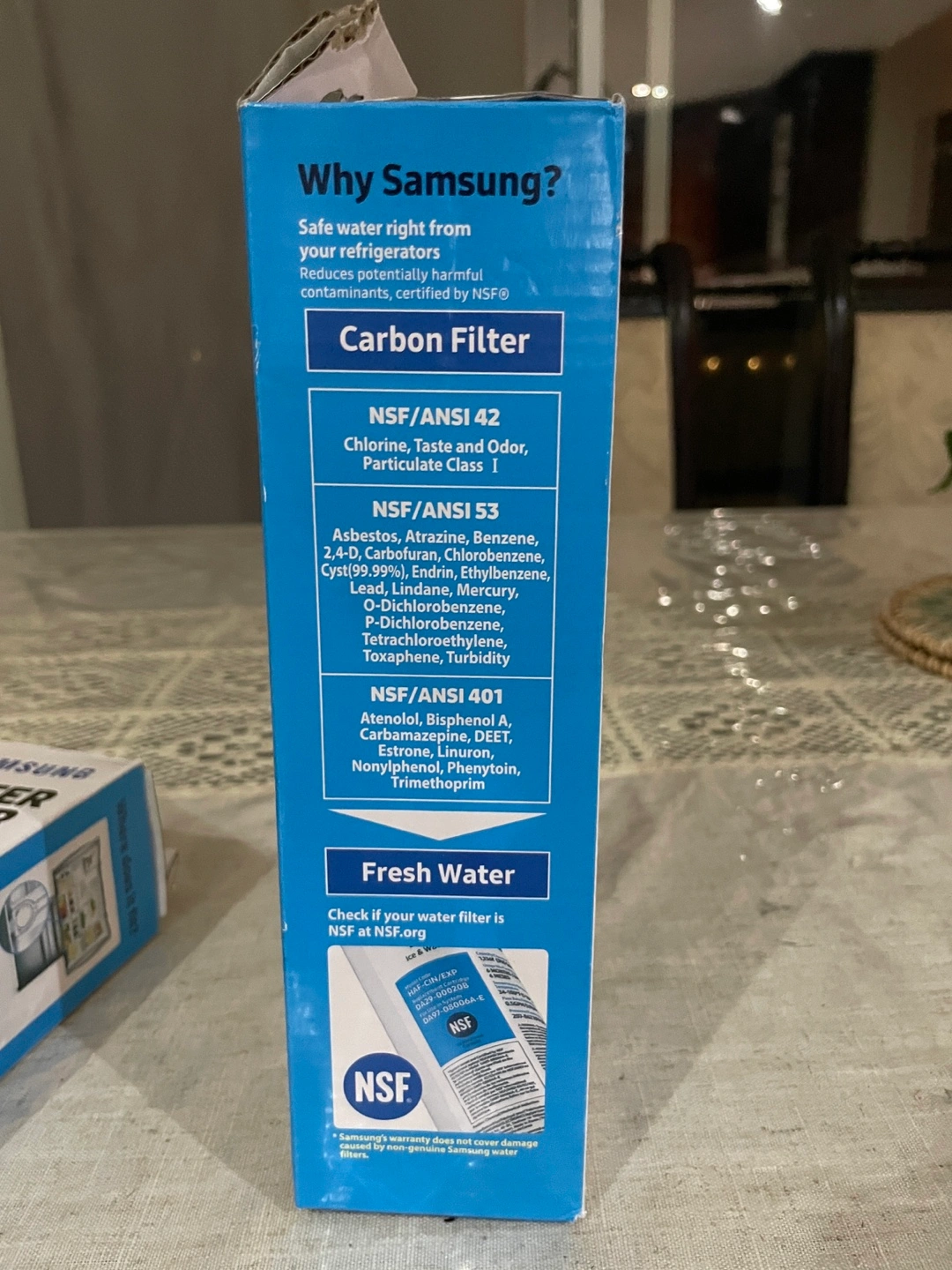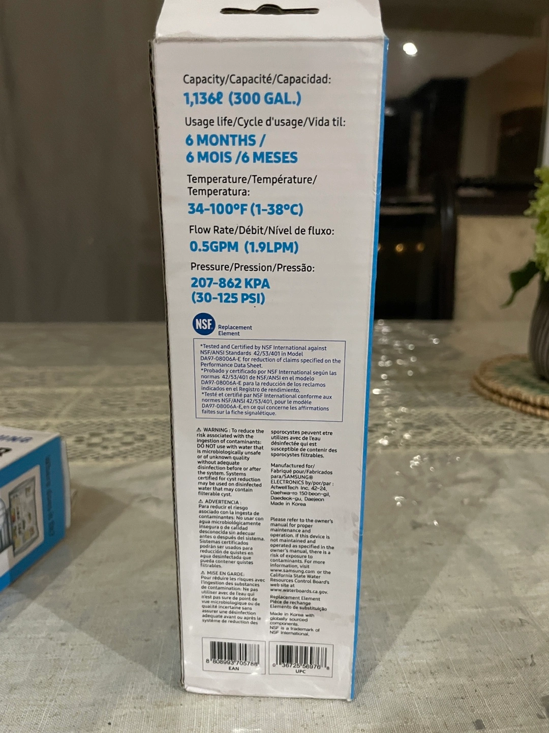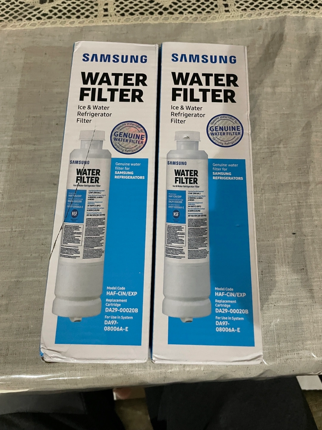I have two brand new Samsung DA29-00020B water filters for sale! These ice and water refrigerator filters are compatible with Samsung refrigerators. Key features: - Reduces potentially harmful contaminants - Certified by NSF - Provides fresh, clean water Each filter has a capacity of 1,136 litres (300 gallons) and a usage life of 6 months.