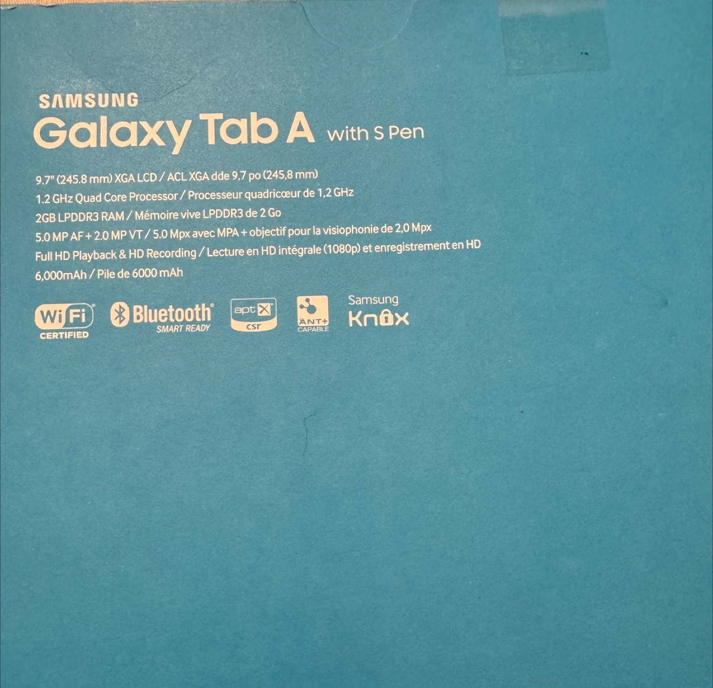9.7" tablet, includes S Pen. Wi-Fi and Bluetooth capabilities.Comes in original box and a case.