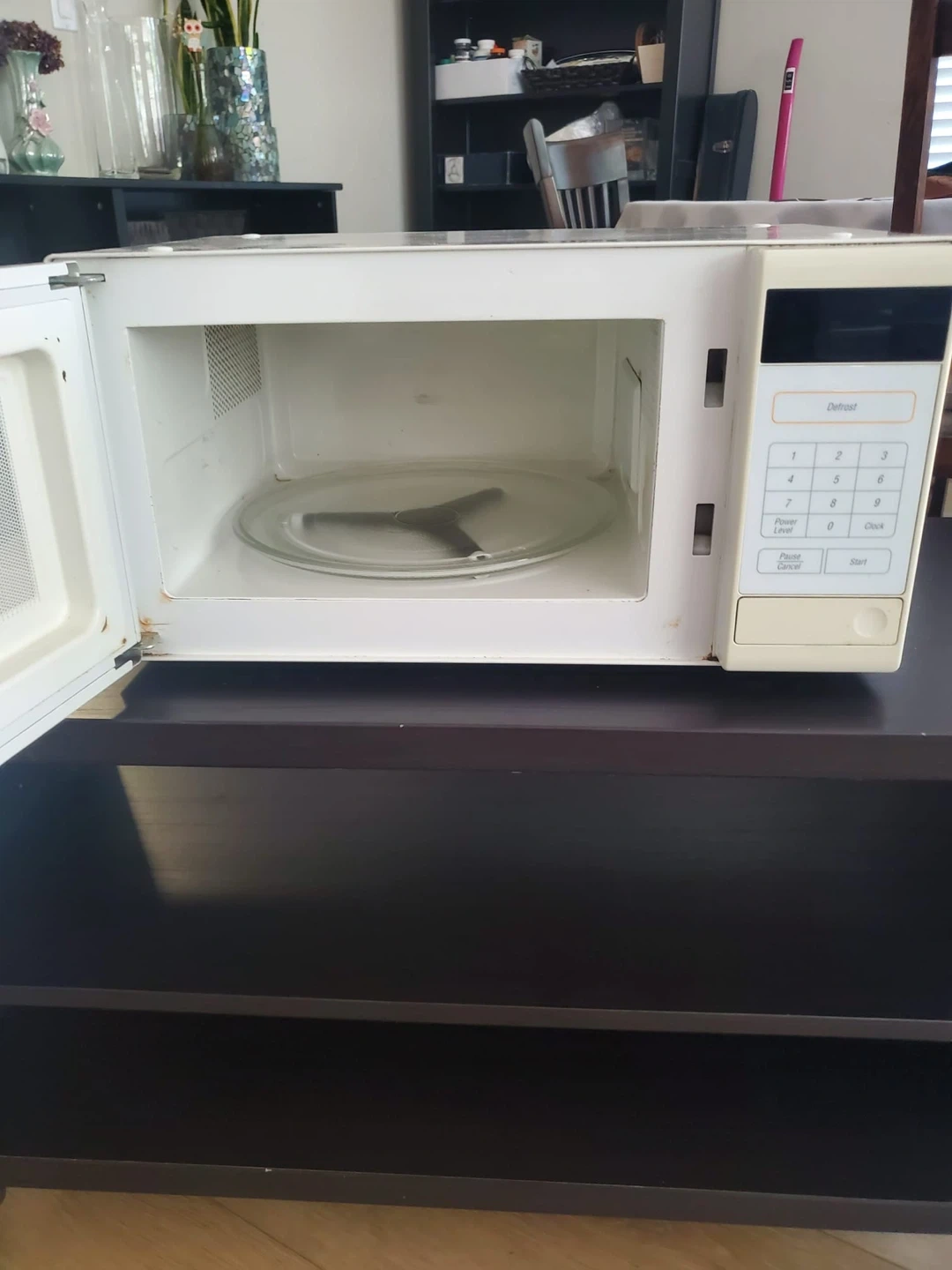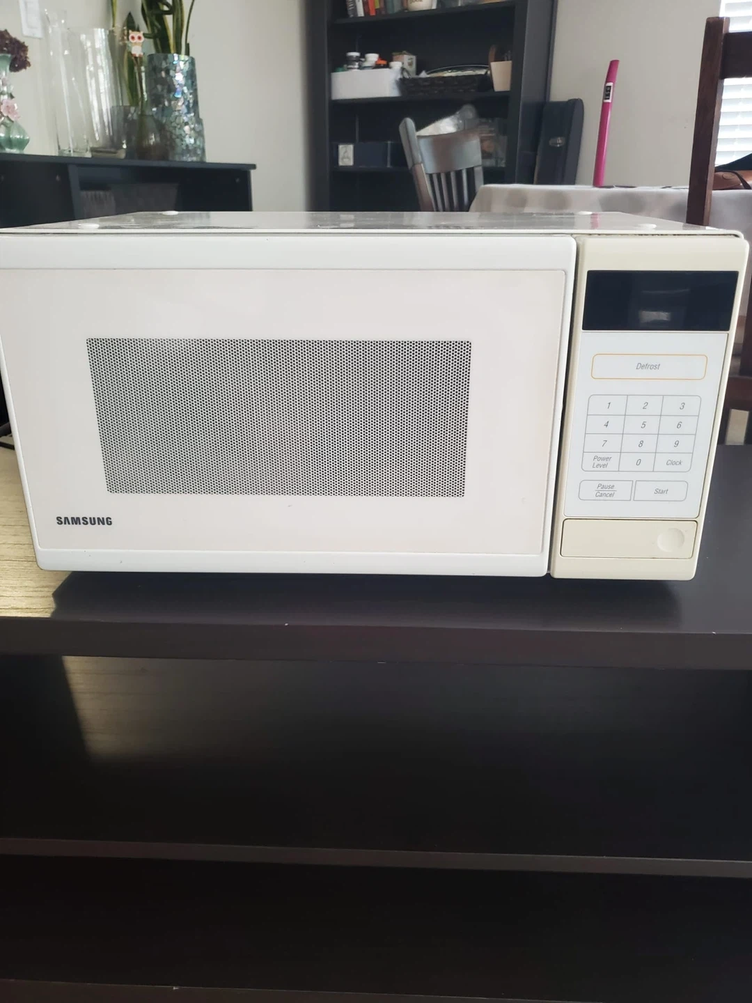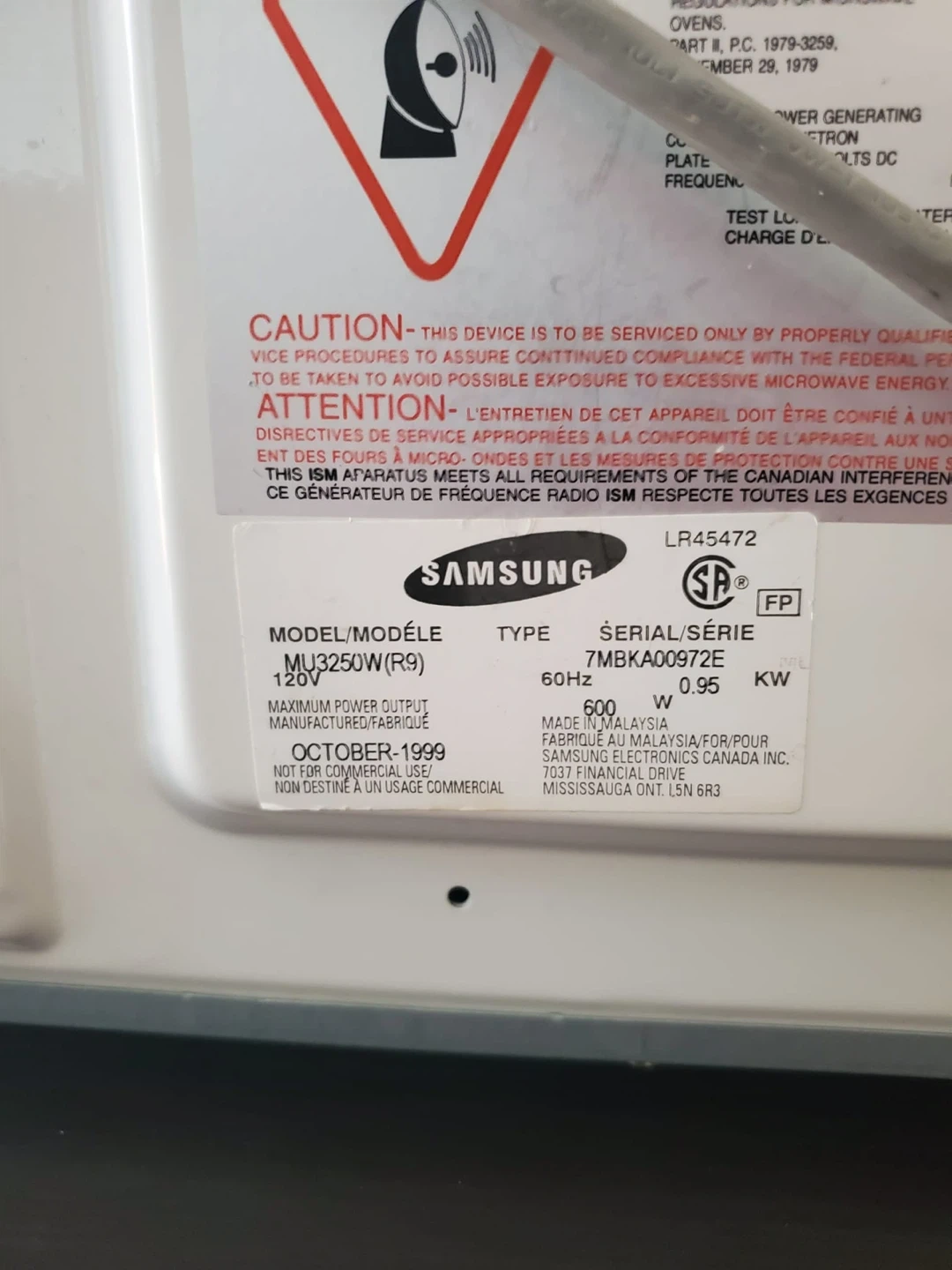 Selling a Samsung microwave oven, model number MU3250W(R9). It was manufactured in October 1999. It's a 120V, 600W microwave. Ready to heat up your meals! Working condition. This is not full size microwave size is 18" x 12" x 9"