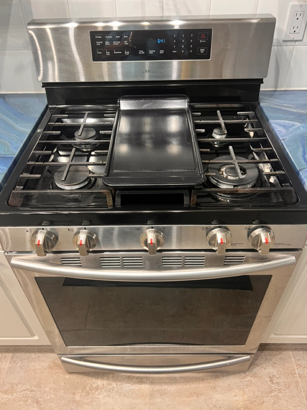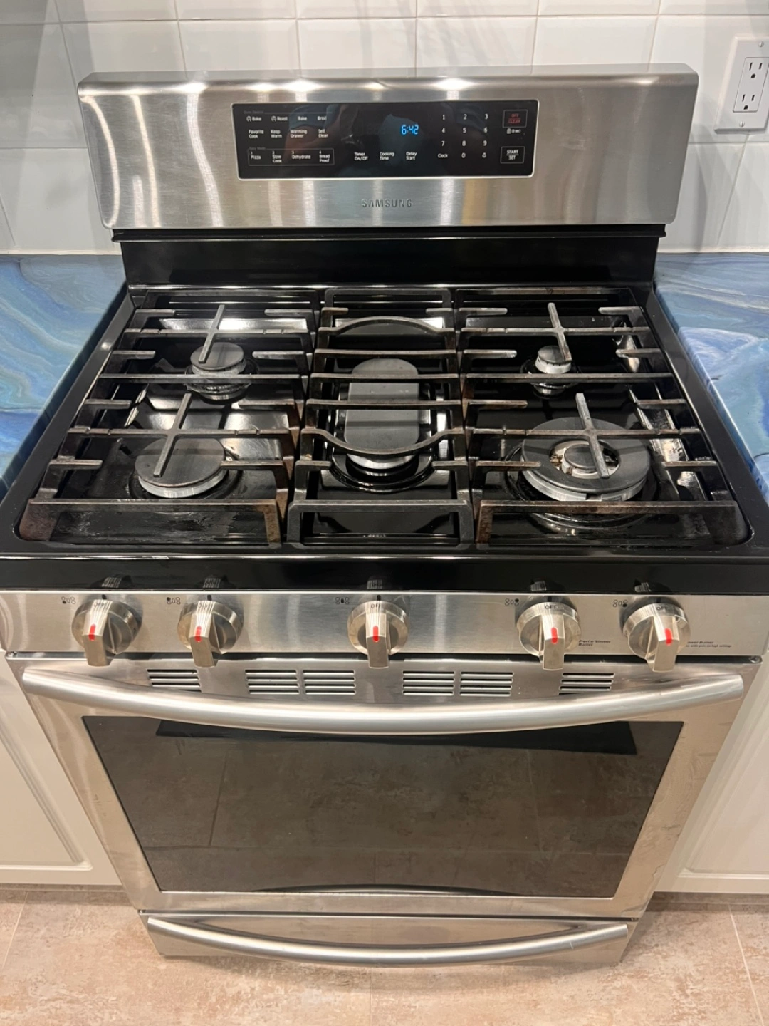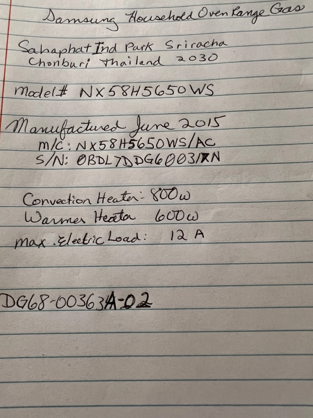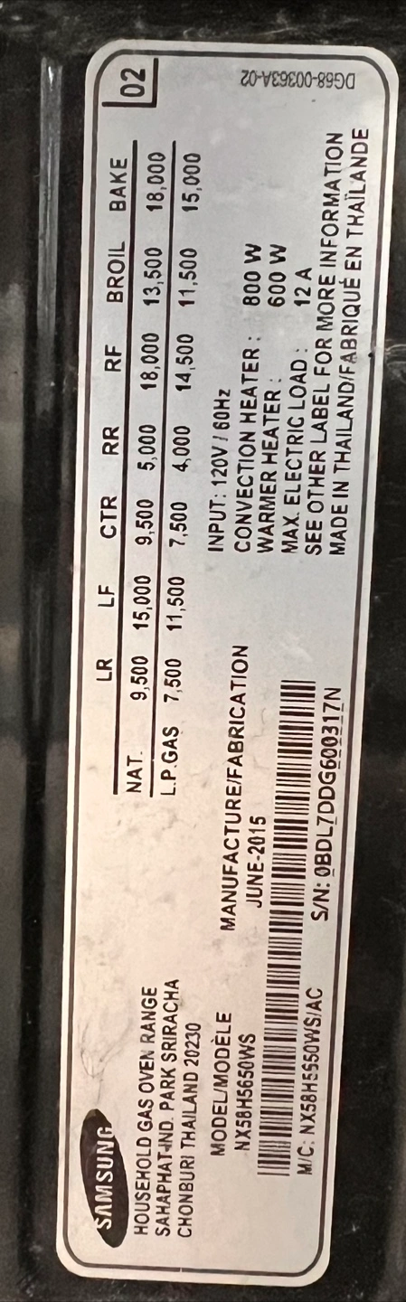 Selling a Samsung household gas oven range. Model number: NX58H5650WS Manufactured in June 2015. Convection heater: 800W Warmer heater: 600W Max electric load: 12A