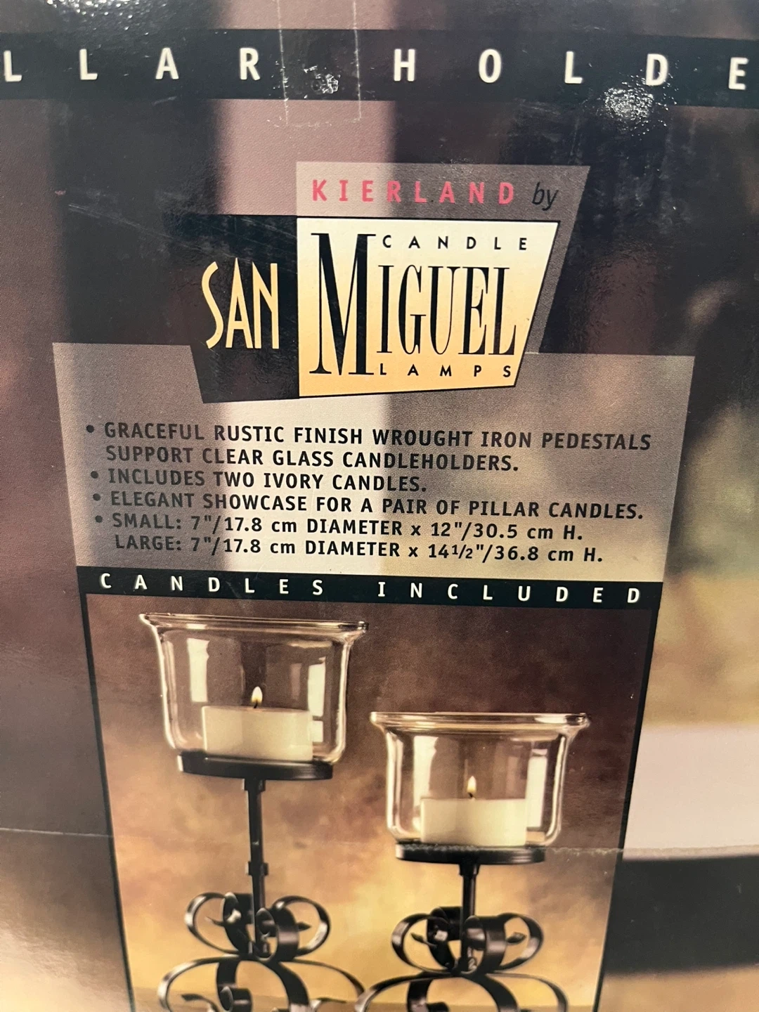 Selling a brand new set of San Miguel Candle Lamps pillar holders, still in the original box! These feature graceful rustic finish wrought iron pedestals and support clear glass candleholders. The set includes two ivory candles. The small size is 7"/17.8 cm diameter x 12"/30.5 cm H, and the large size is 7"/17.8 cm diameter x 14½"/36.8 cm H
