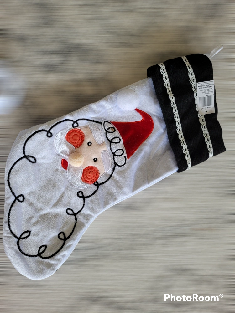 Here's a brand new Santa Christmas stocking! It's white with a cute Santa face design and a black cuff with lace detailing. Perfect for adding some holiday cheer!