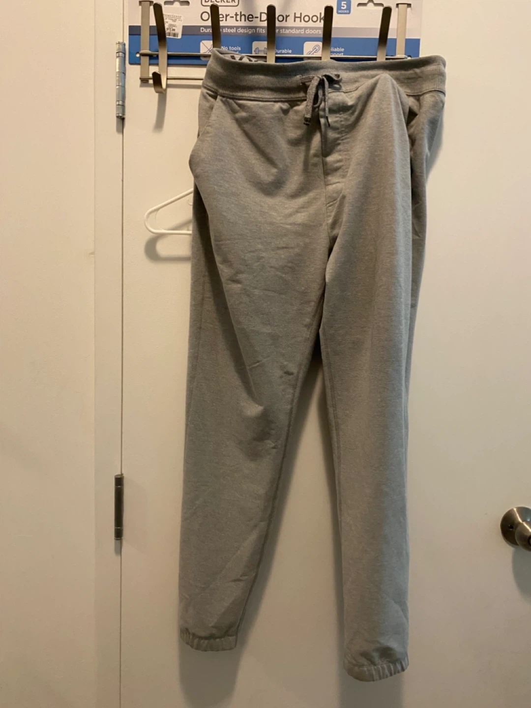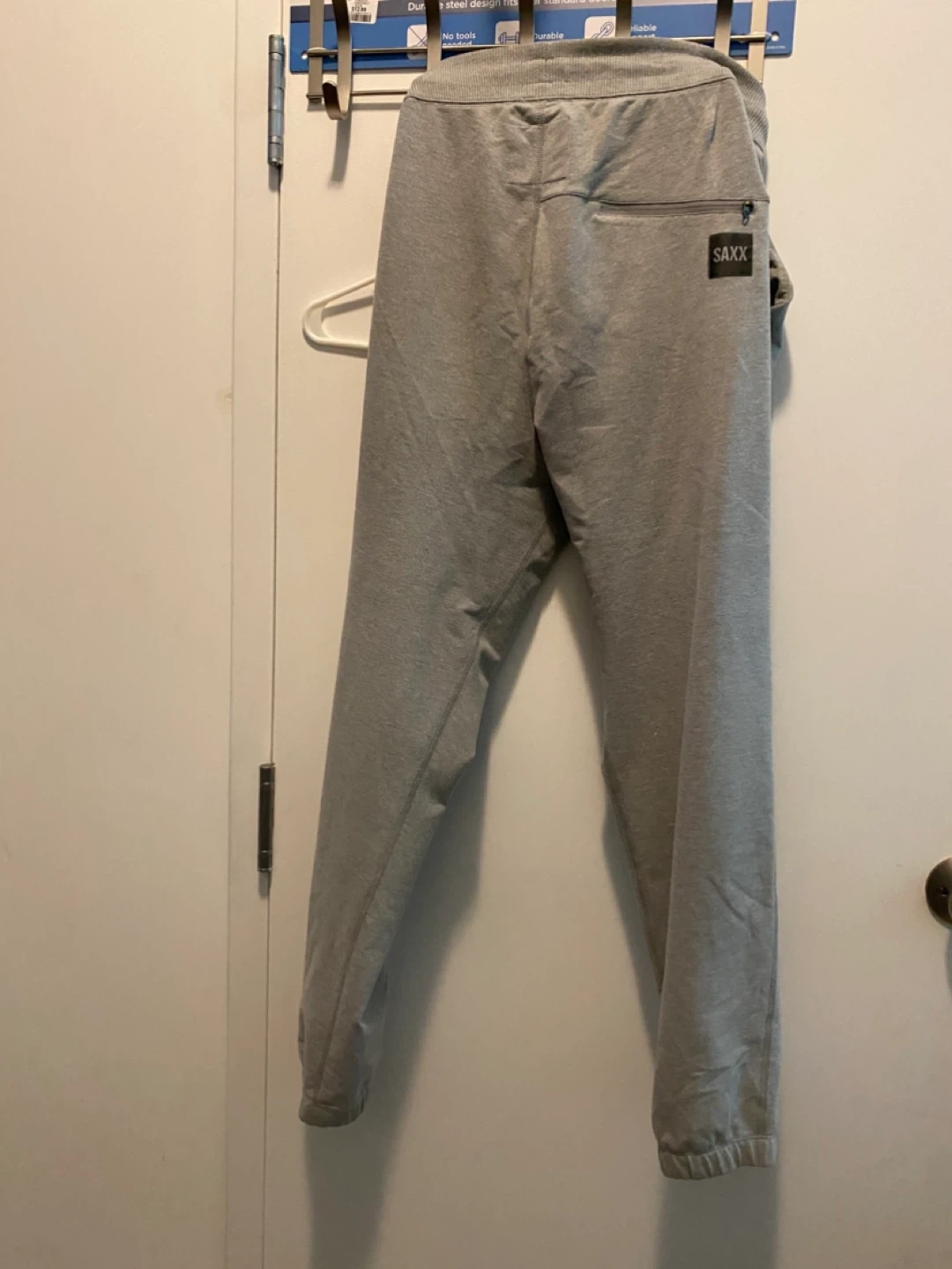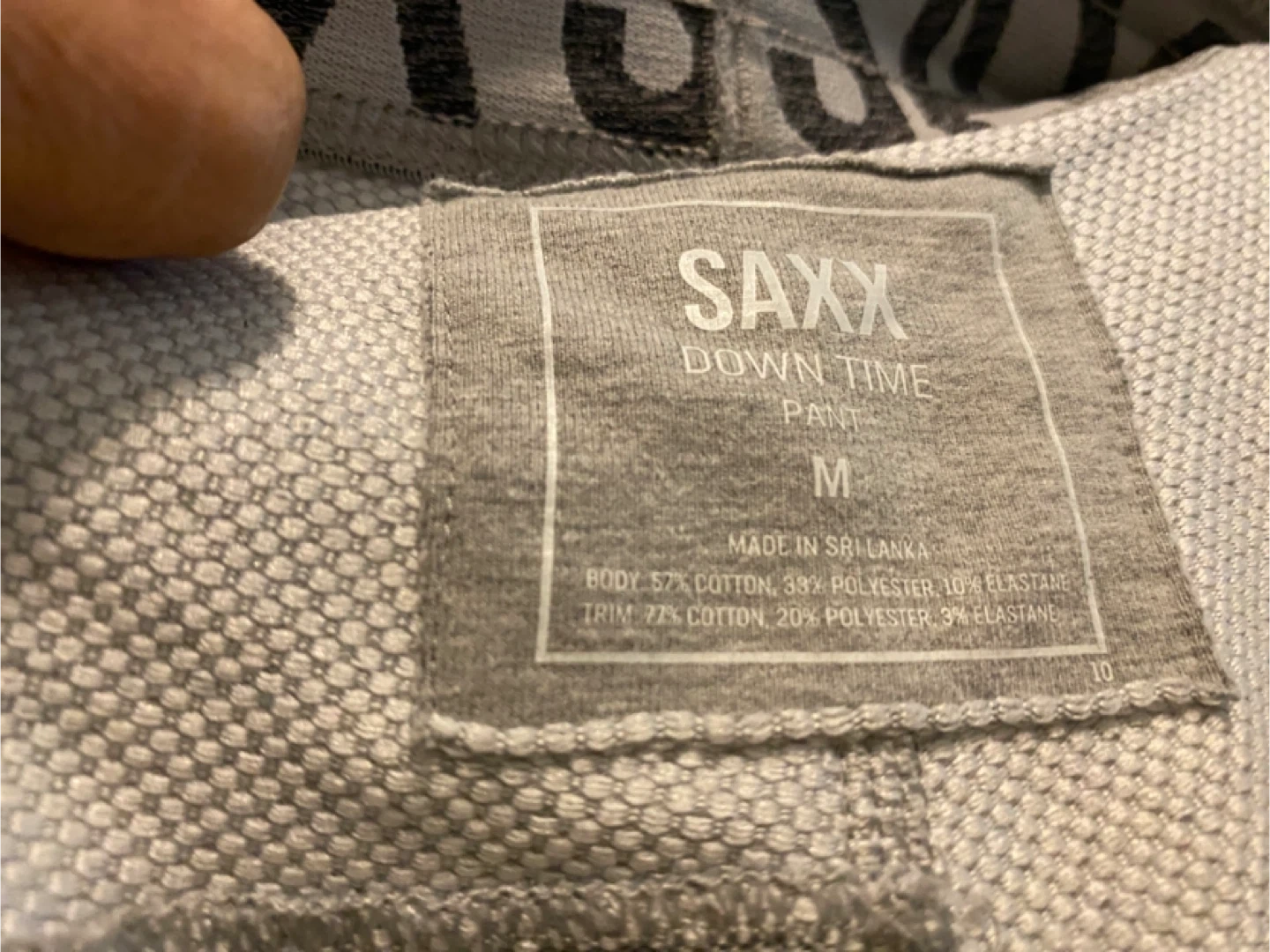 Selling a pair of SAXX Down Time pants in size medium. They are a comfy heather grey colour and made from 57% cotton, 33% polyester, and 10% elastane. The trim is 77% cotton, 20% polyester, and 3% elastane