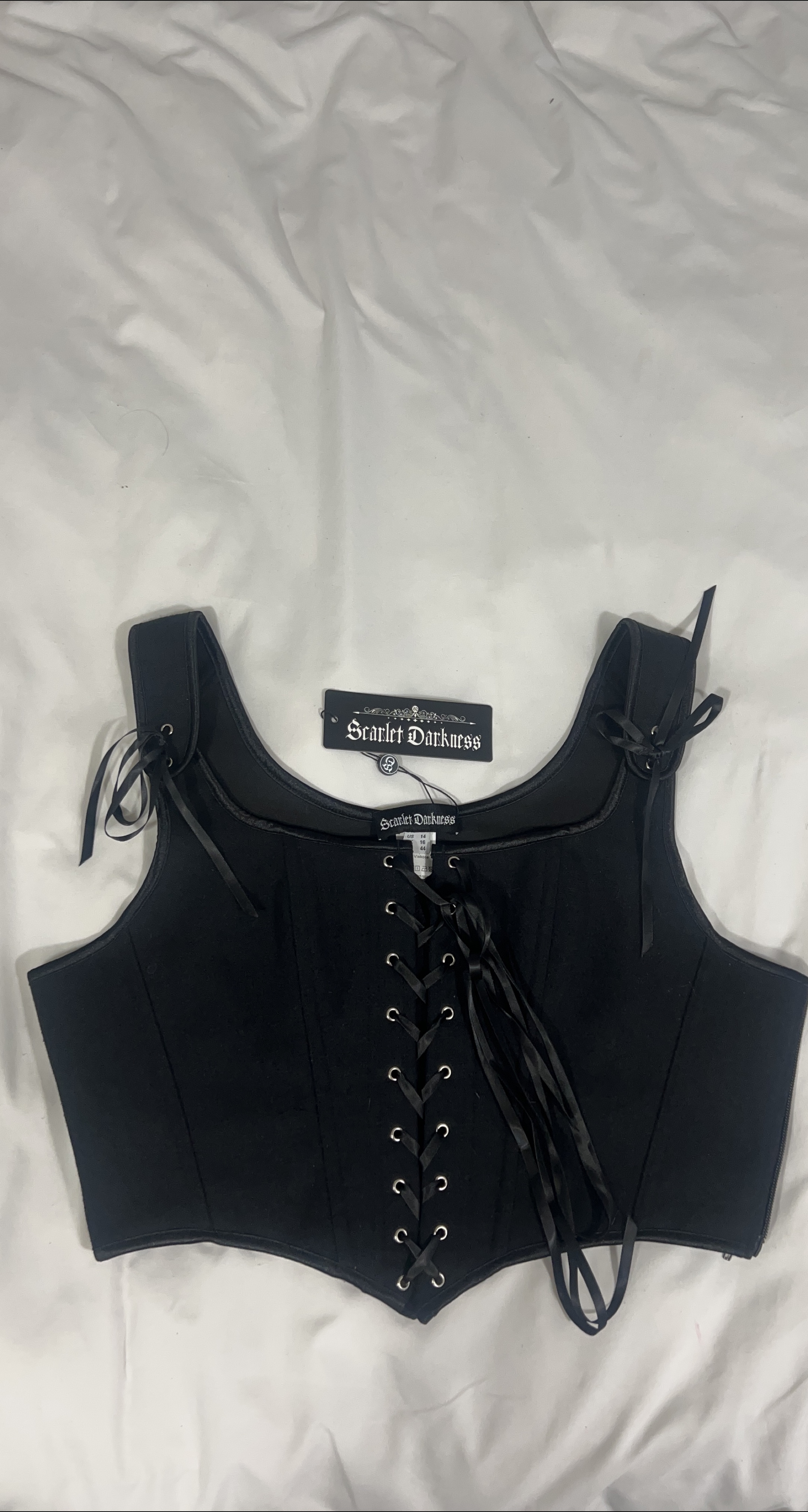 Here's a stylish black corset top from Scarlet Darkness! It's a size US 14. Perfect for adding a touch of elegance to any outfit
