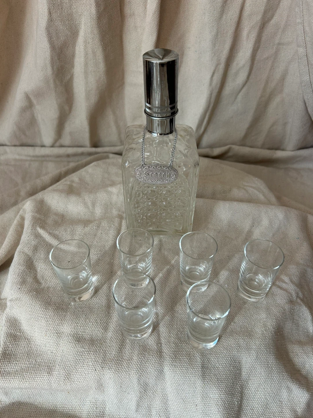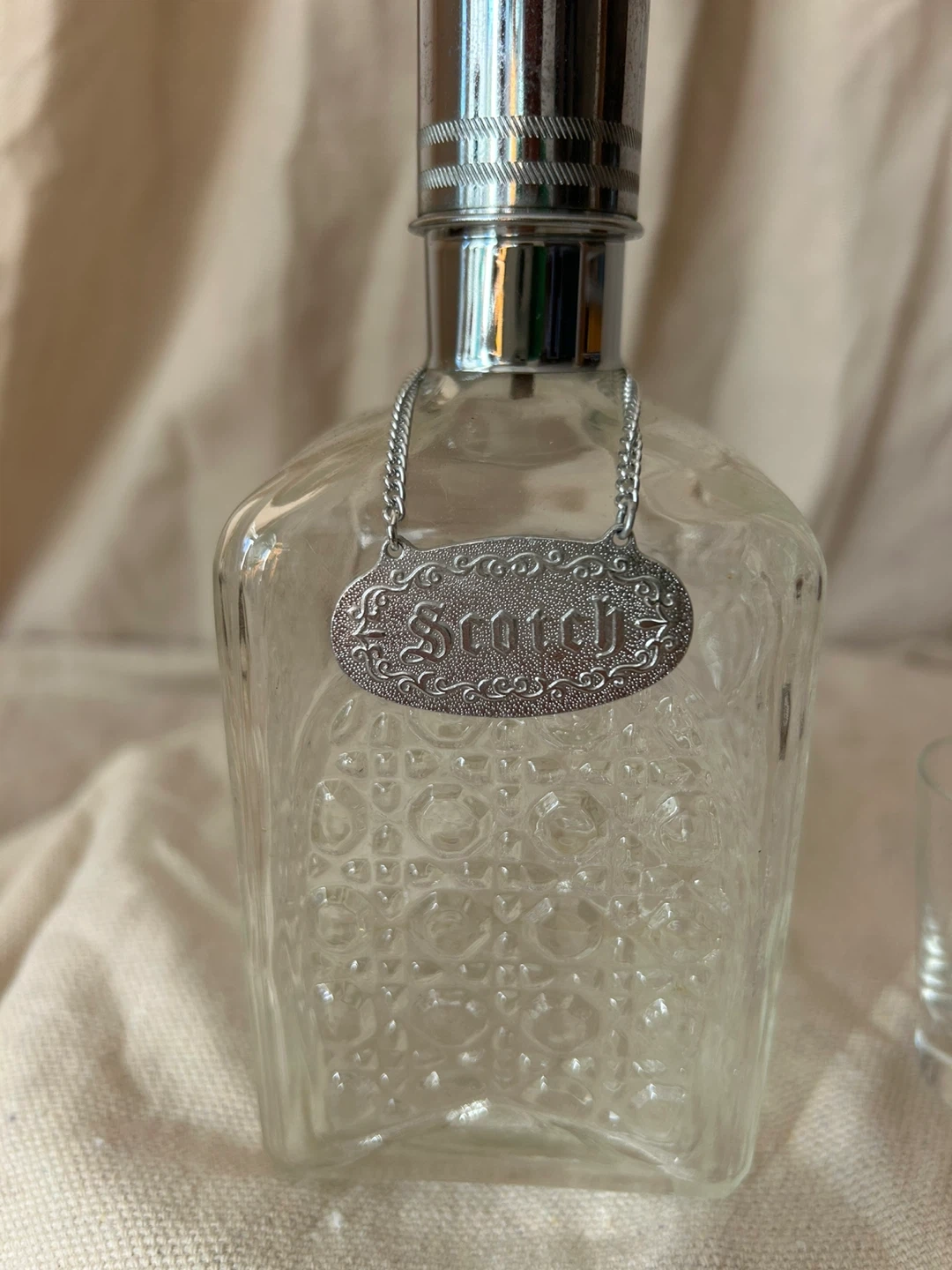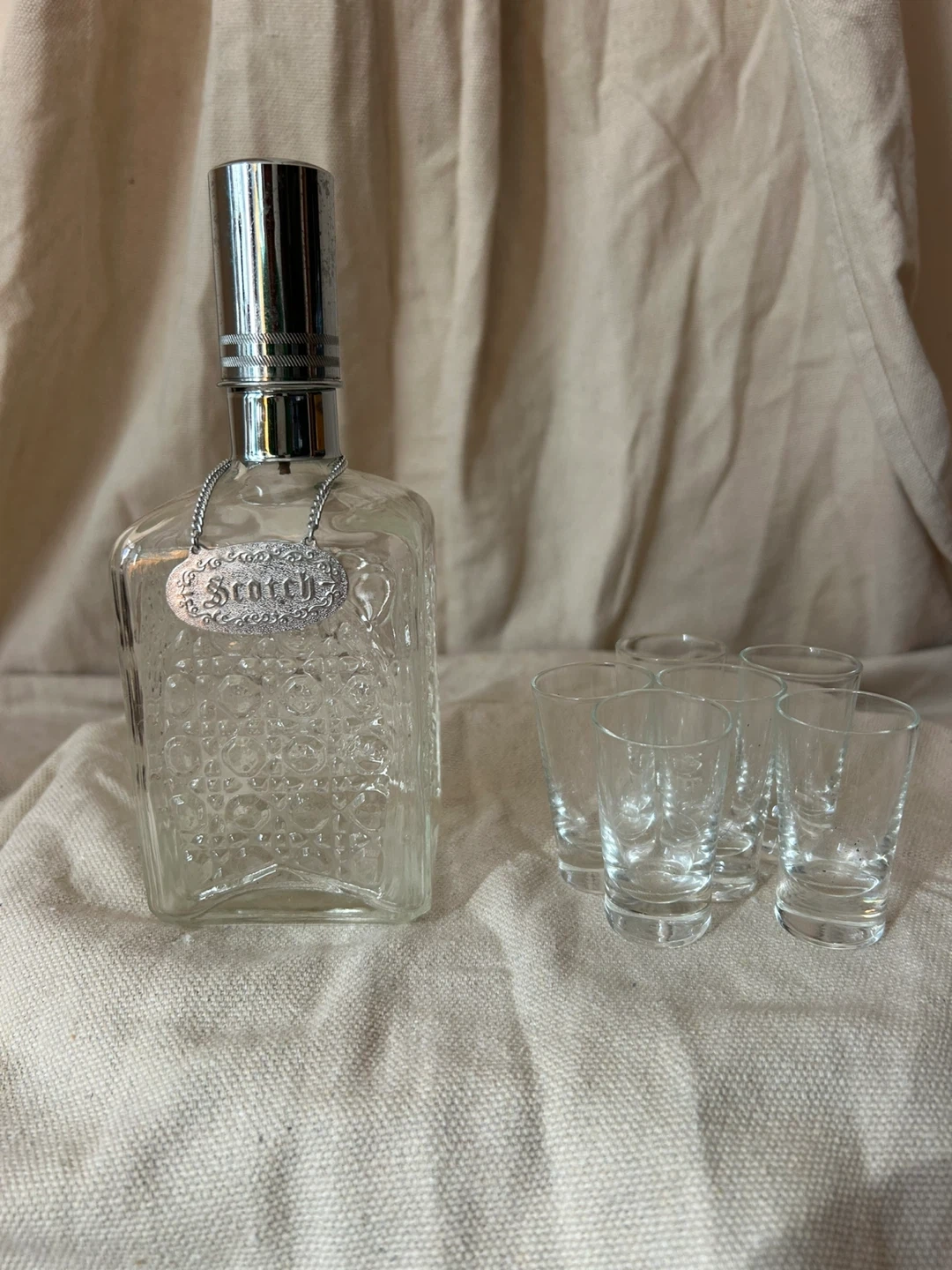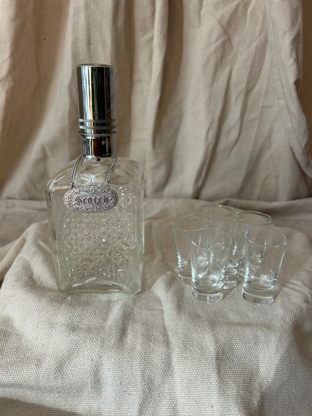 Selling a clear glass decanter with a silver-toned "Scotch" label and a set of shot glasses. The decanter has a textured pattern and a silver-toned cap. Perfect for your home bar!