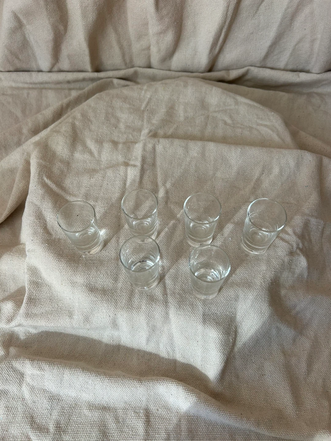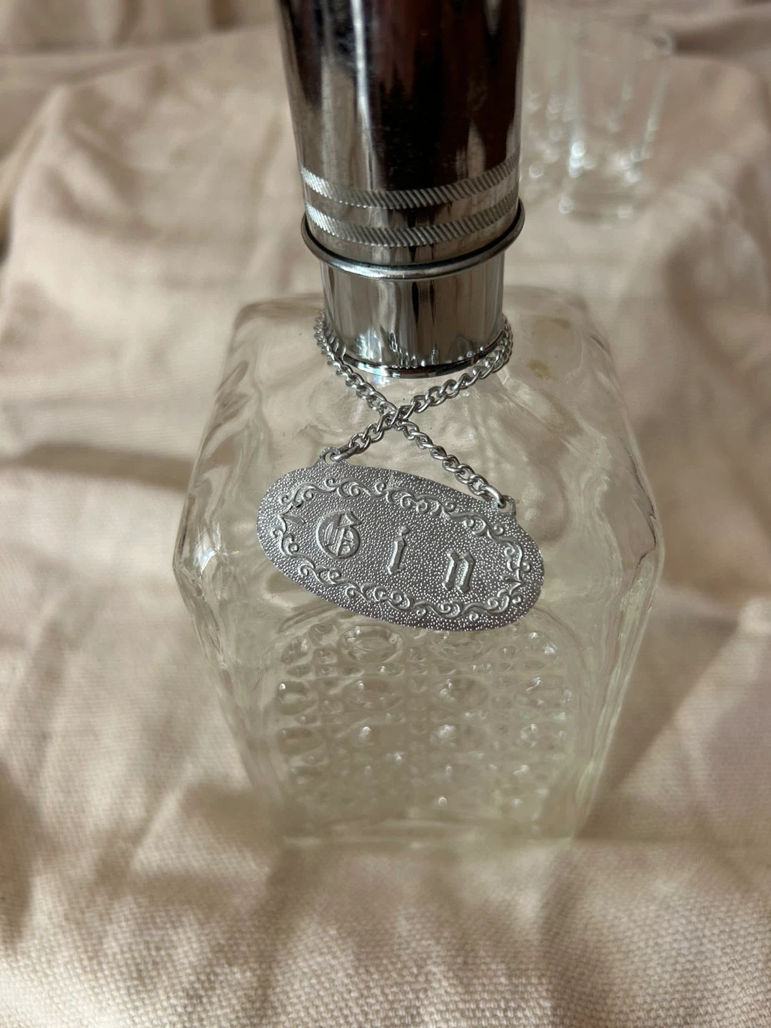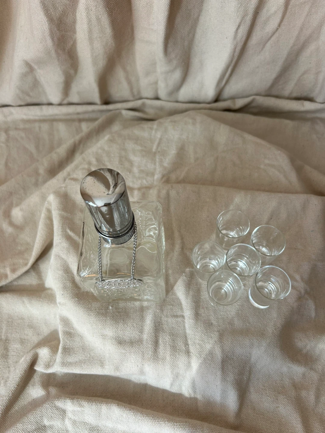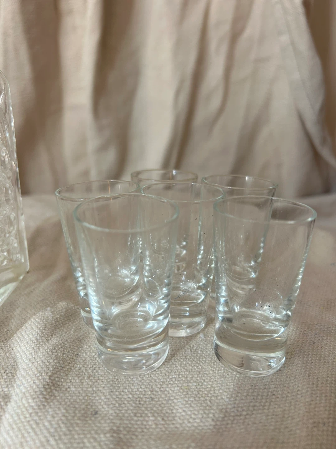 Selling a clear glass decanter with a silver-toned "Scotch" label and a set of shot glasses. The decanter has a textured pattern and a silver-toned cap. Perfect for your home bar!