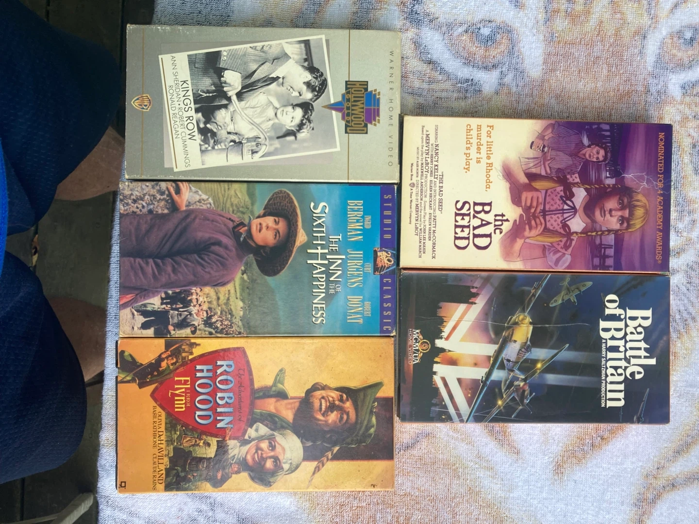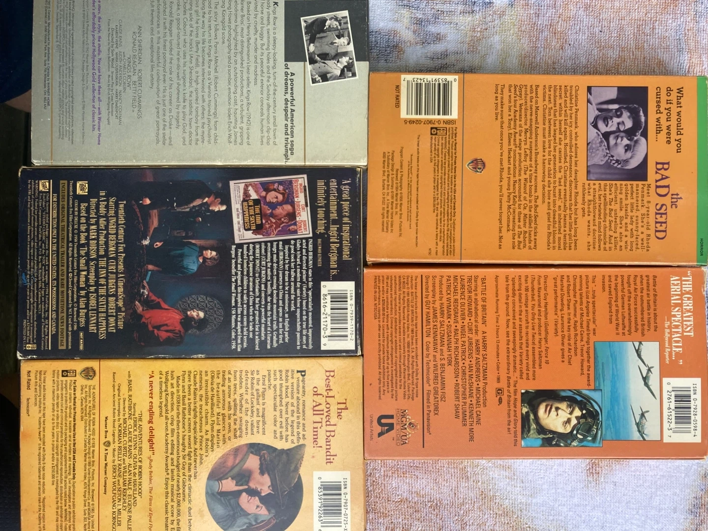 Selling a collection of VHS movies. Titles include The Bad Seed, Battle of Britain, Robin Hood, The Inn of the Sixth Happiness, and King's Row. Perfect for collectors or those who enjoy classic films!