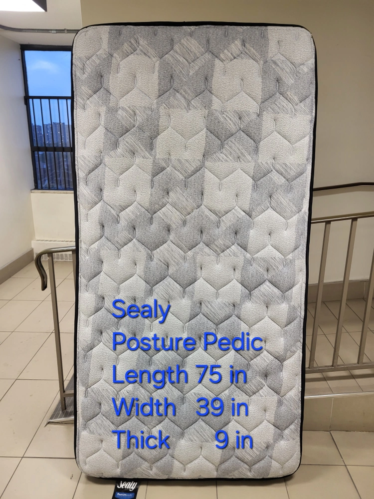 Sealy Posture Pedic Technology Twin Mattress Set with Box. Barely used like new. Note: All pictures are original raw ones taken by my old Samsung phone. Original price is way more + tax. Here is the lowest fair price to go away faster. SPECIFICATIONS: Sealy mattresses, particularly the Posturepedic line, are: * Targeted Support (Posturepedic Technology): Reinforced support, often with denser foam or specialized coils, in the middle third of the mattress to align the back and core. * Pressure Relief: Use of various comfort layers, including gel-infused memory foam (like ComfortSense Gel Foam), to contour to the body and disperse weight. * Coil Systems: Utilizing individually wrapped coils (PrecisionFit or Posture Touch Pocket Coils) for reduced motion transfer and responsive, deep-down support. * Edge Support: Reinforced borders for increased sleeping surface and stability when sitting on the edge. * Cooling & Protection: Features like MoistureProtect, SealyChill, and Surface-Guard Technology in the cover and comfort layers for temperature regulation and antimicrobial protection.
