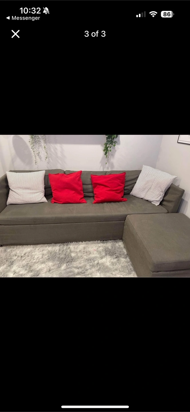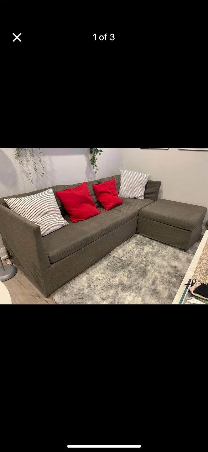 Selling a sectional sofa with a matching ottoman. It's in good condition and would be a great addition to any living room. The cushions are comfy, and the ottoman provides extra seating and storage. Everything is washable sofa covers and cushion covers as well. Sofa is in good condition. Feel free to reach out if you're interested!