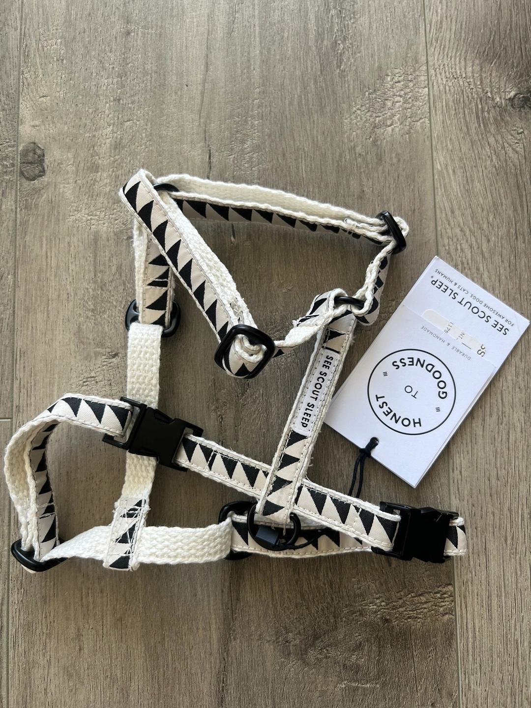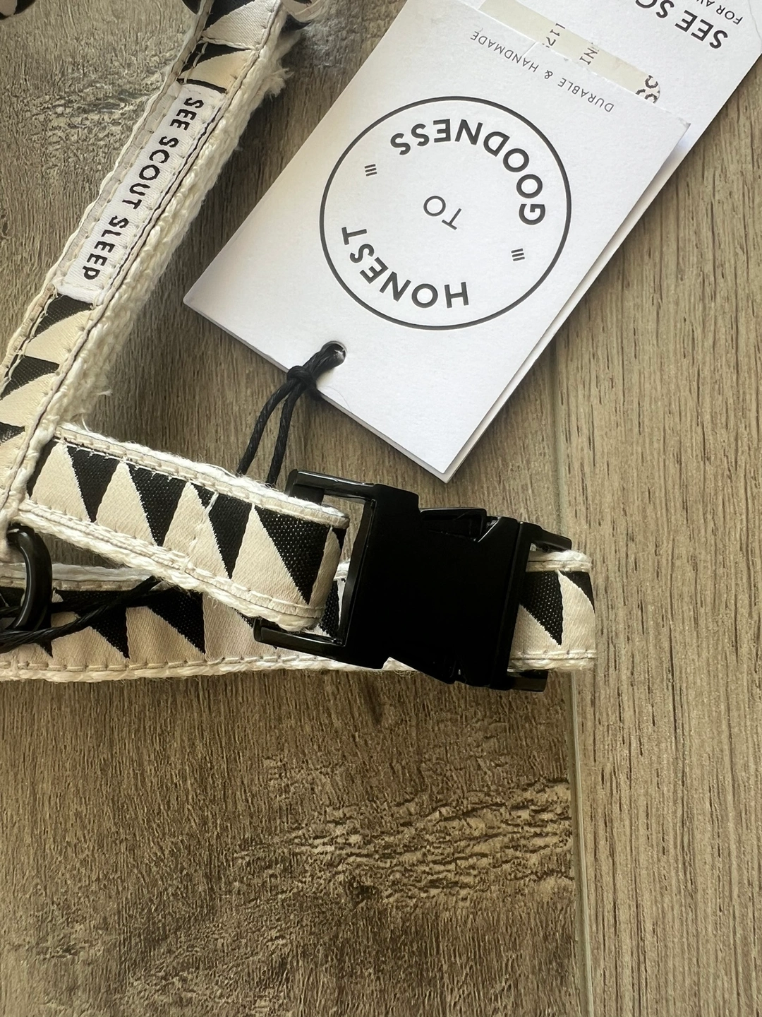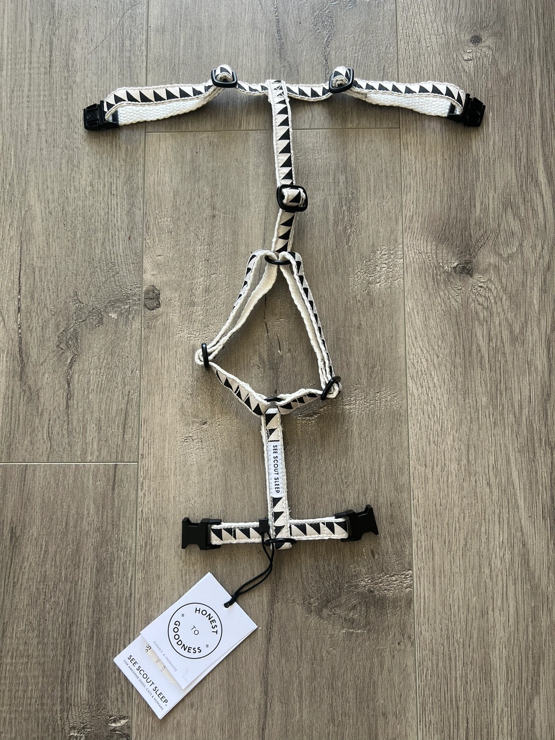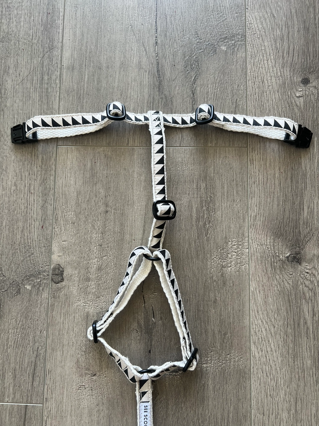 Black and white geometric pattern dog / larger cat harness. ITEM INFO for dog or cat Handcrafted woven hemp harness in off-white. Waxed webbing trim featuring graphic pattern in cream and black at face and back face. · Adjustable cinch fastening · D-ring hardware at press-release fastening · black-tone hardware Size S Size: Neck, Chest XS: 9-12" / 24-30cm, 13-17" / 22-44cm S: 11-16" / 27-40cm, 15-21" / 38-54cm M: 16.5-25" / 42-64cm, 21.5-33" / 54-84cm Hemp, brass. Made in Netherlands.
