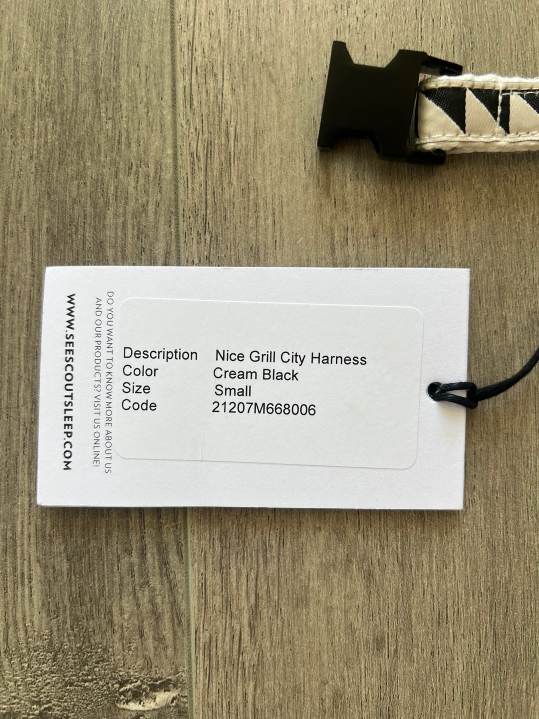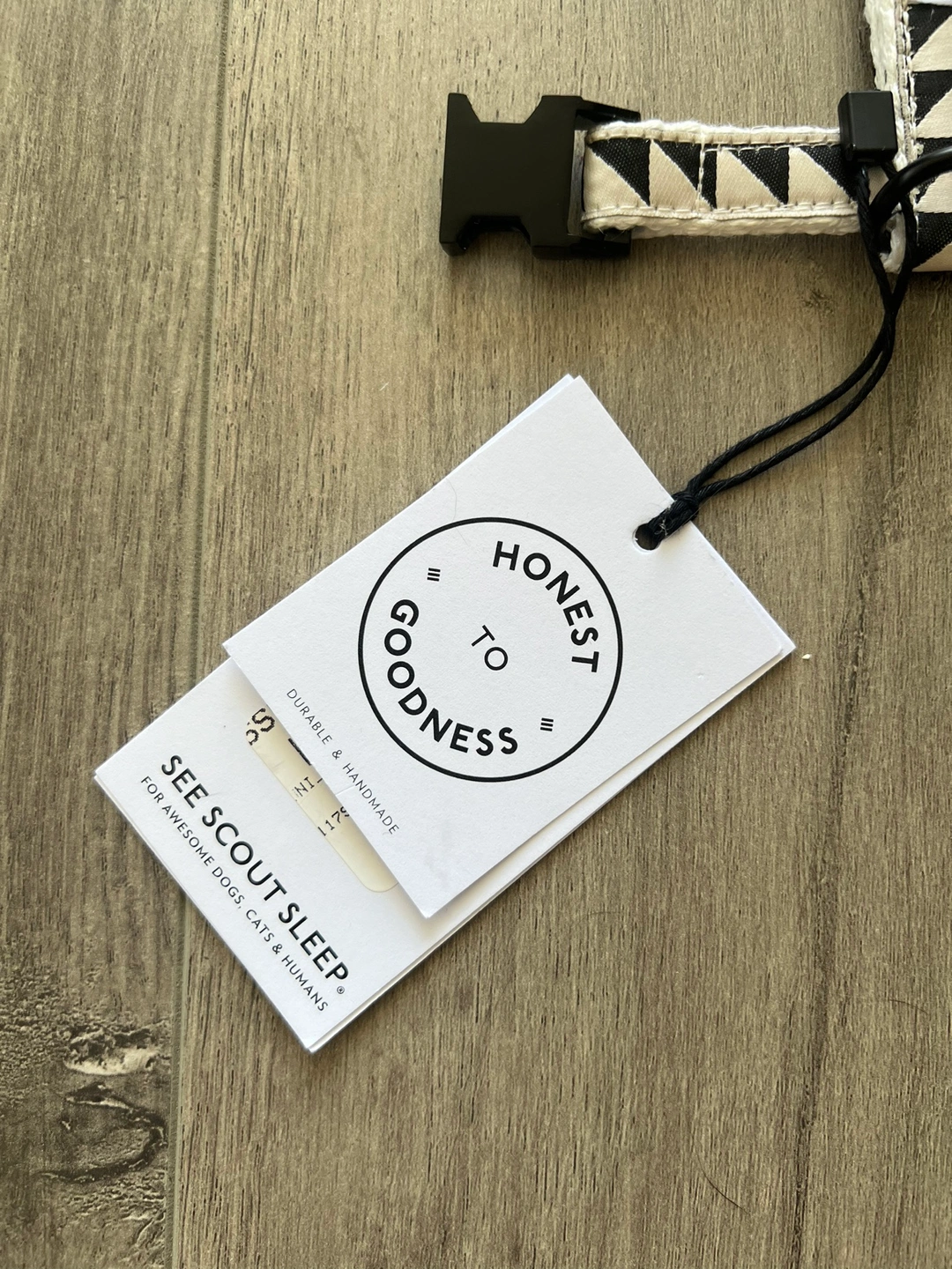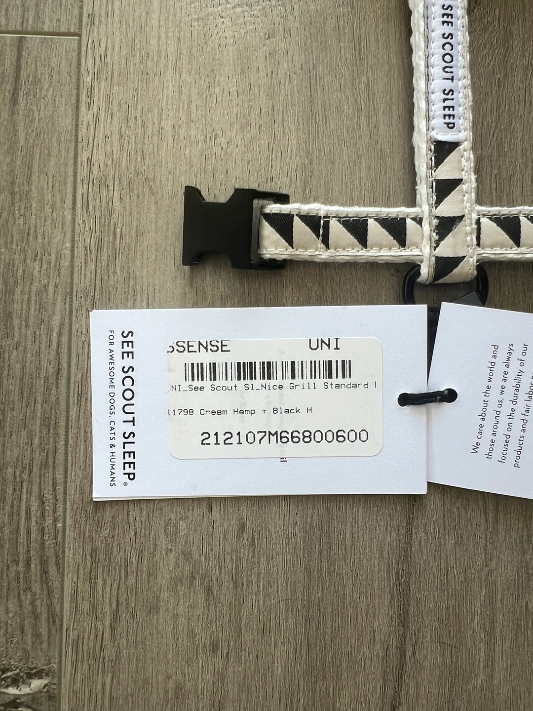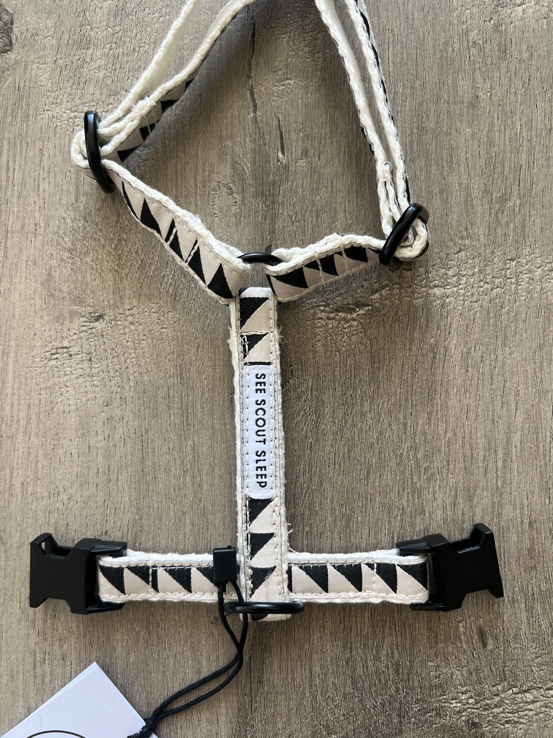 Black and white geometric pattern dog / larger cat harness. ITEM INFO for dog or cat Handcrafted woven hemp harness in off-white. Waxed webbing trim featuring graphic pattern in cream and black at face and back face. · Adjustable cinch fastening · D-ring hardware at press-release fastening · black-tone hardware Size S Size: Neck, Chest XS: 9-12" / 24-30cm, 13-17" / 22-44cm S: 11-16" / 27-40cm, 15-21" / 38-54cm M: 16.5-25" / 42-64cm, 21.5-33" / 54-84cm Hemp, brass. Made in Netherlands.