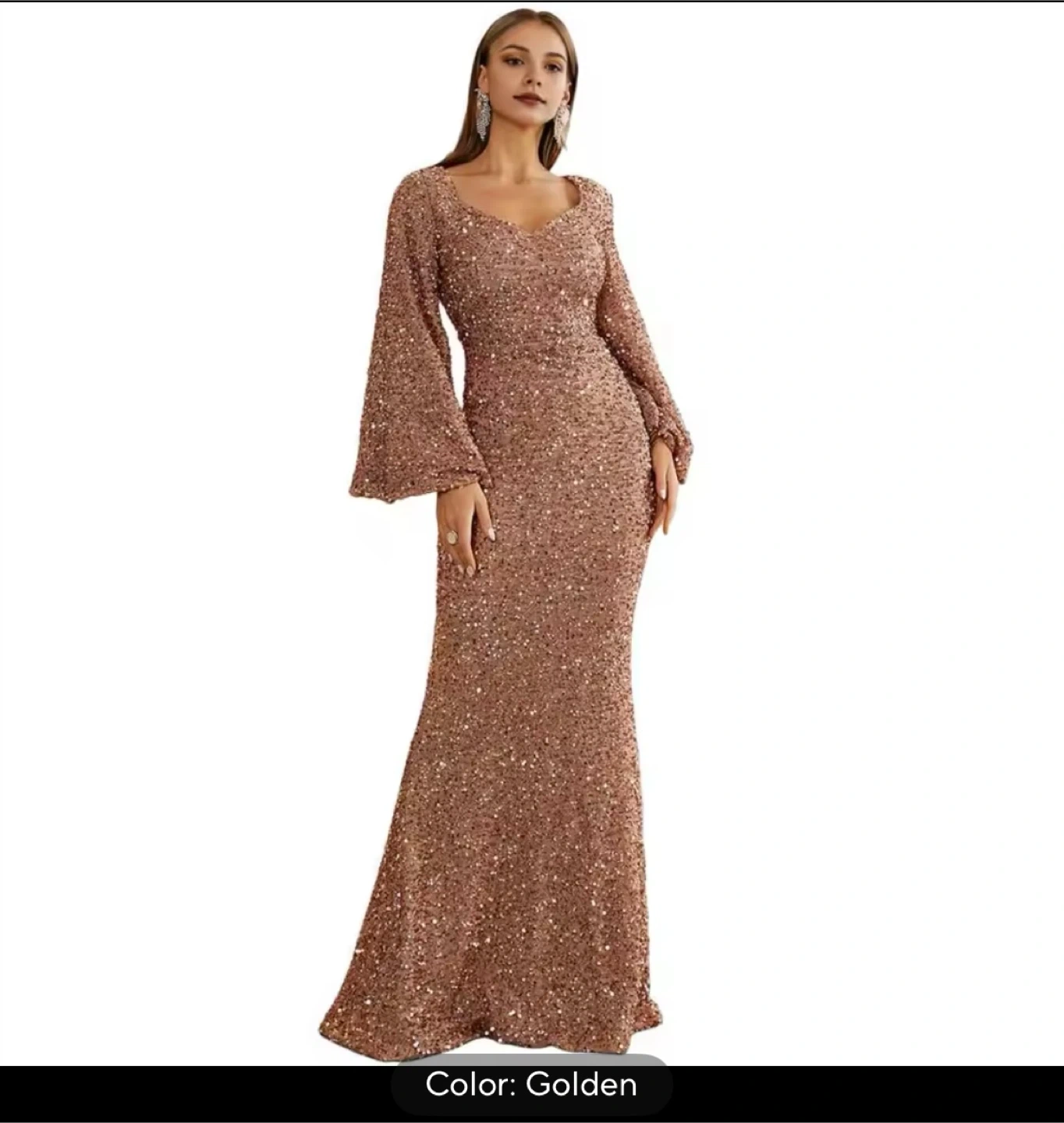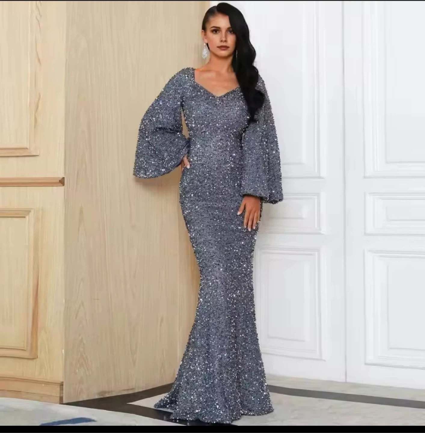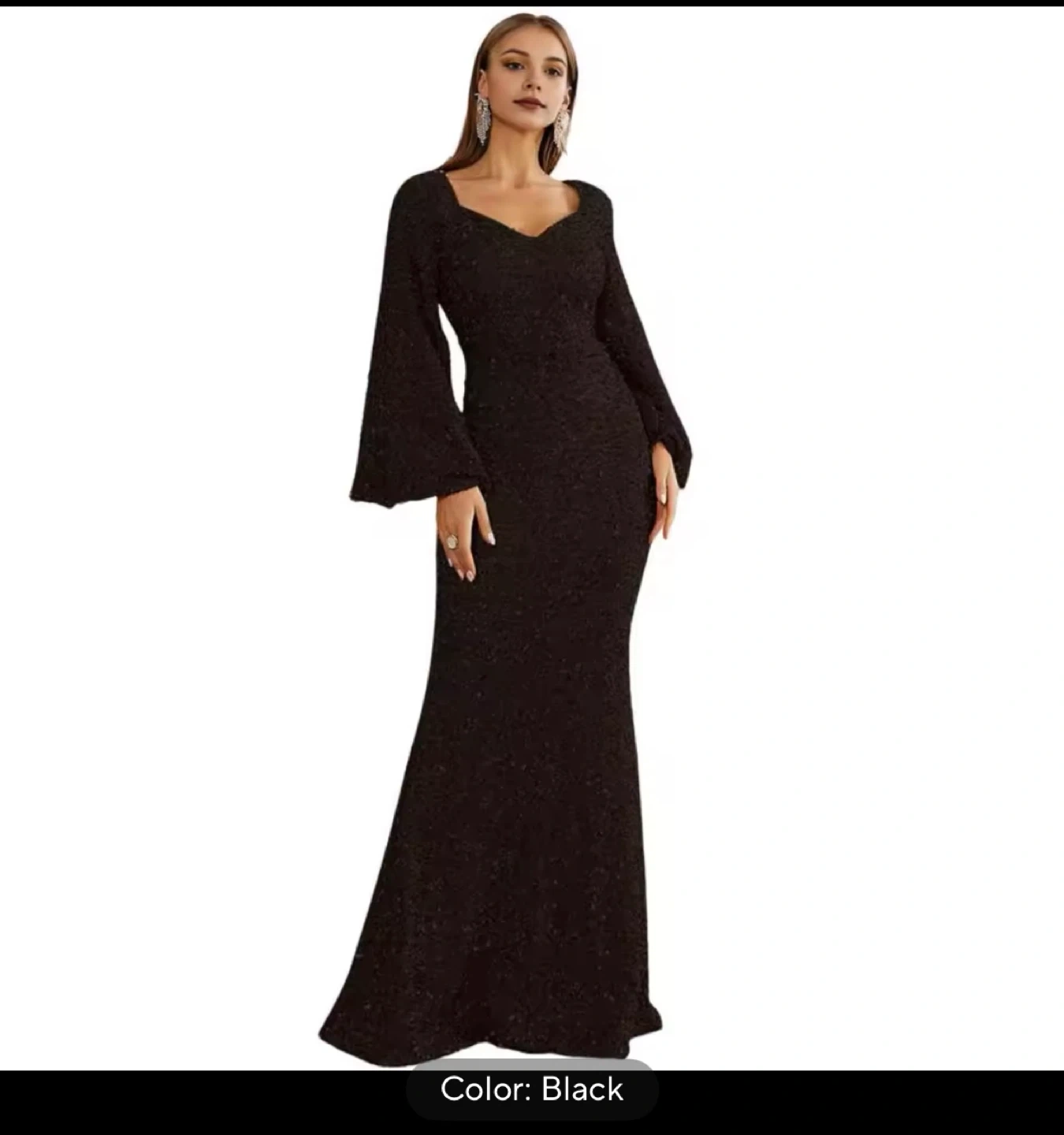 Gorgeous sequin maxi dress with bell sleeves! Available in black, golden, and grey. Perfect for a special occasion or evening out. It has a flattering silhouette and eye-catching sparkle