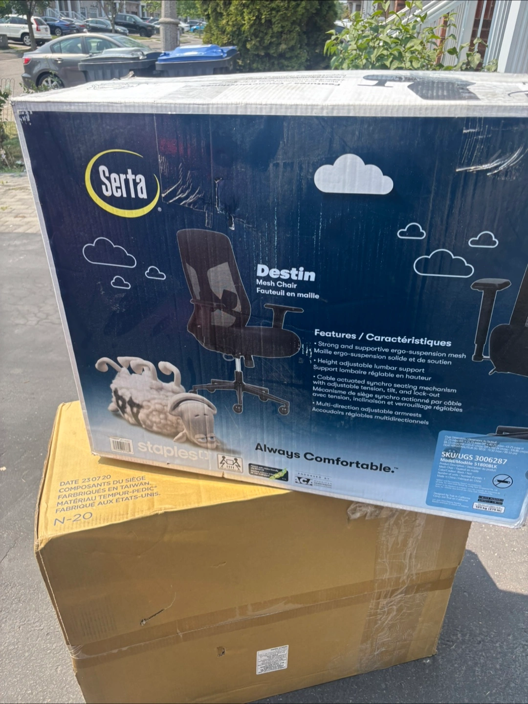 Selling a brand new Serta Destin mesh chair still in its original box! This chair features: - Strong and supportive ergo-suspension mesh - Height adjustable lumbar support - Cable actuated synchro seating mechanism with adjustable tension, tilt, and lock-out - Multi-direction adjustable armrests Always Comfortable!