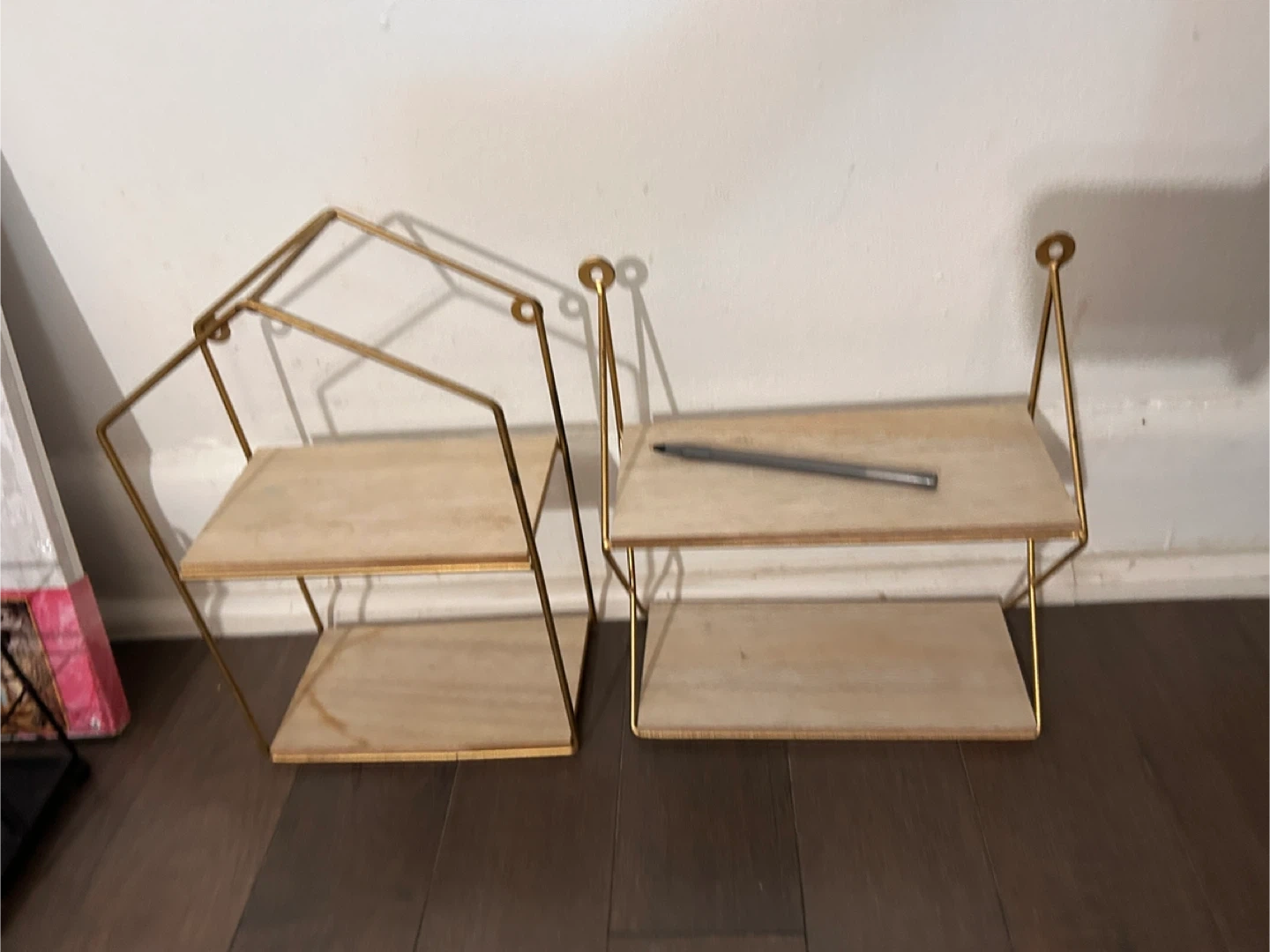 Selling a set of two wall shelves with gold metal frames. One shelf has a house-shaped frame, while the other is rectangular. They're perfect for adding a touch of style to any room and displaying your favourite items