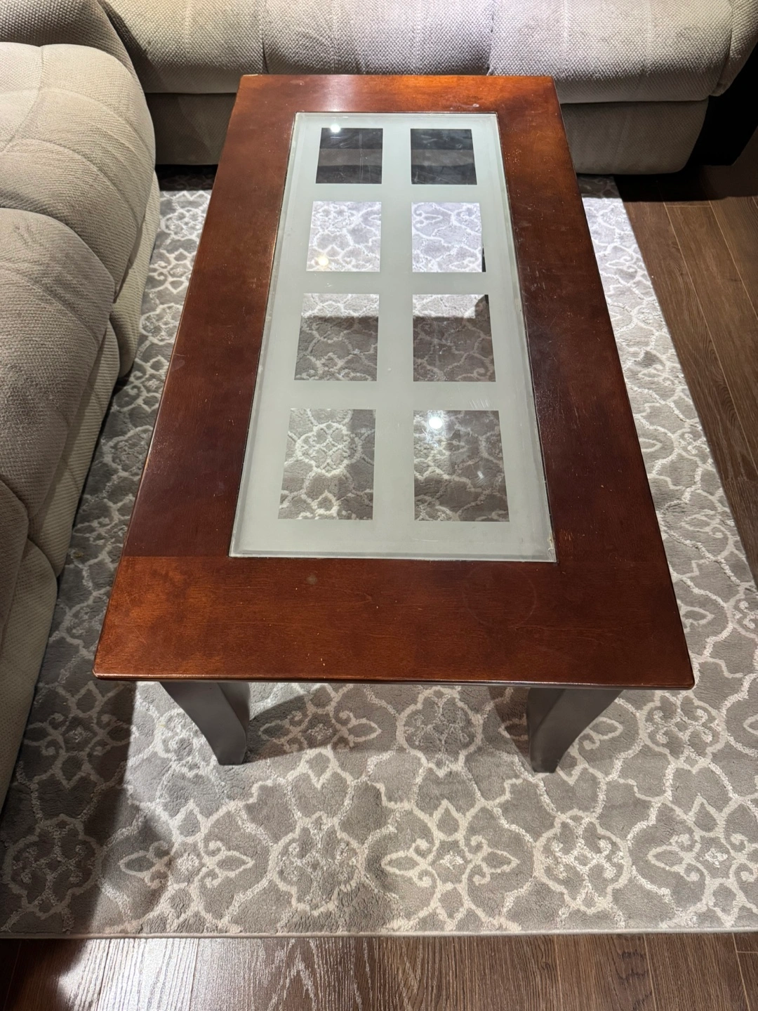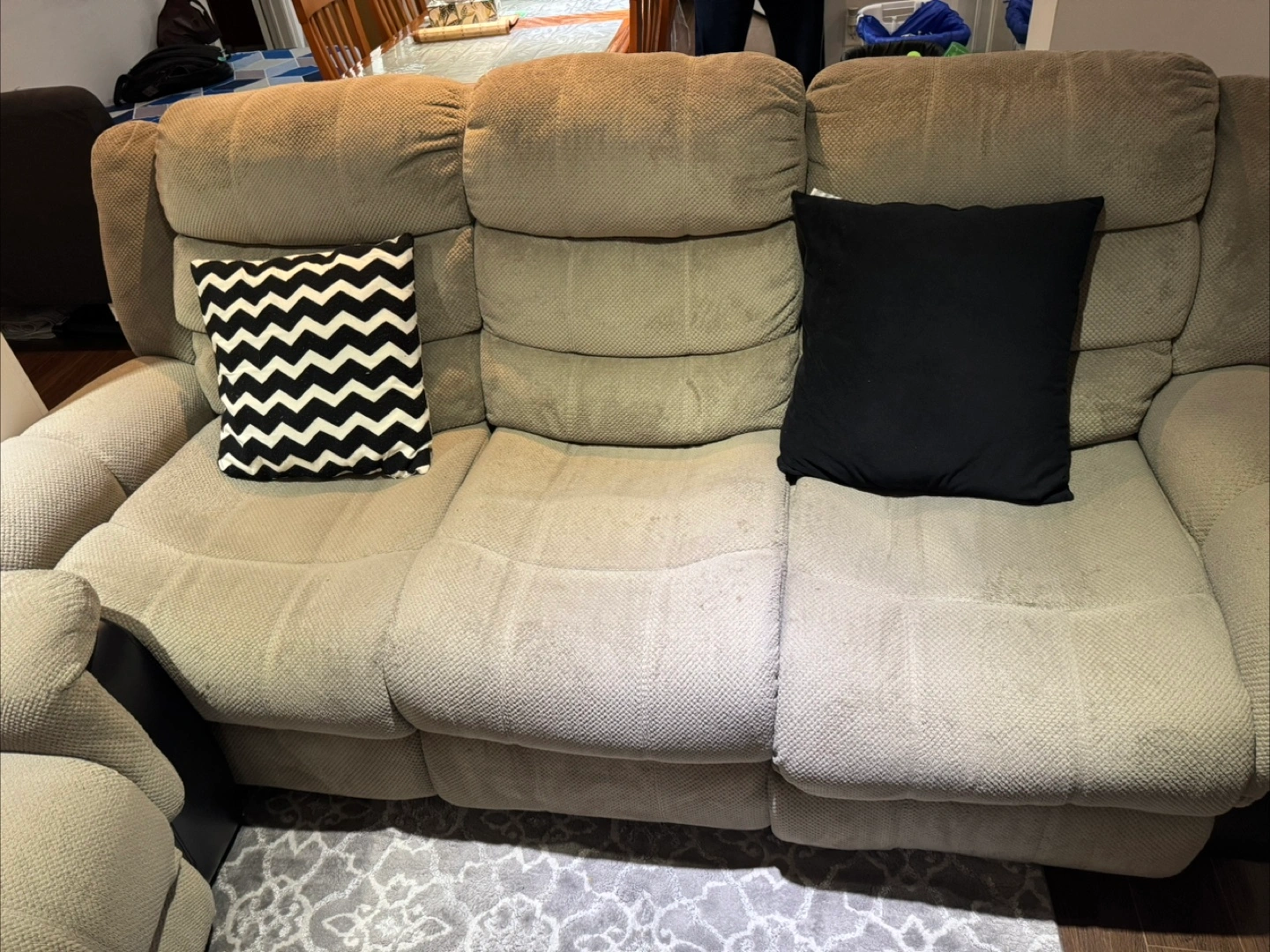 Selling a set of 2 comfy three-seat reclining sofa. It's in good condition and perfect for relaxing after a long day. The sofa features a neutral beige colour that will easily match any living room decor. Includes 1 coffee table as well