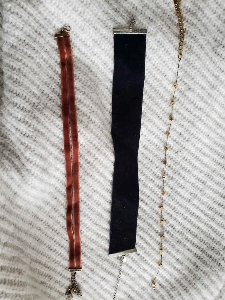 90s inspired chokers. 2 are cashmere. One is gold. 1. Thick cashmere black choker with silver clasp 2. Double stranded pink cashmere choker with gold clasp 3. Gold stars choker #thriftypicks