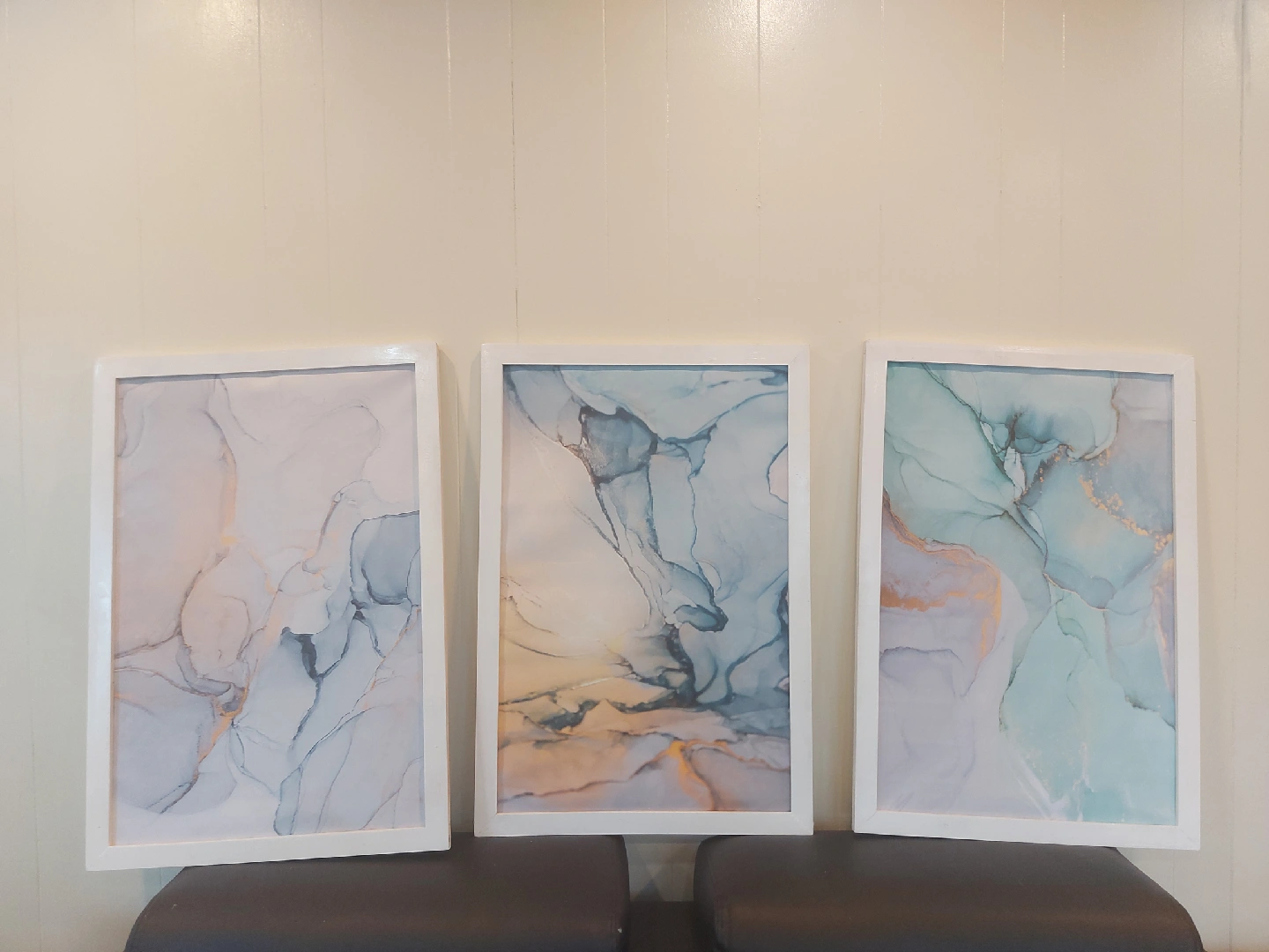 Selling a set of three framed abstract wall art pieces! They feature beautiful, flowing designs in soft, muted colours. The frames are a clean white, which complements the artwork nicely. Perfect for adding a touch of modern elegance to any room 3 pc for 70 dollar