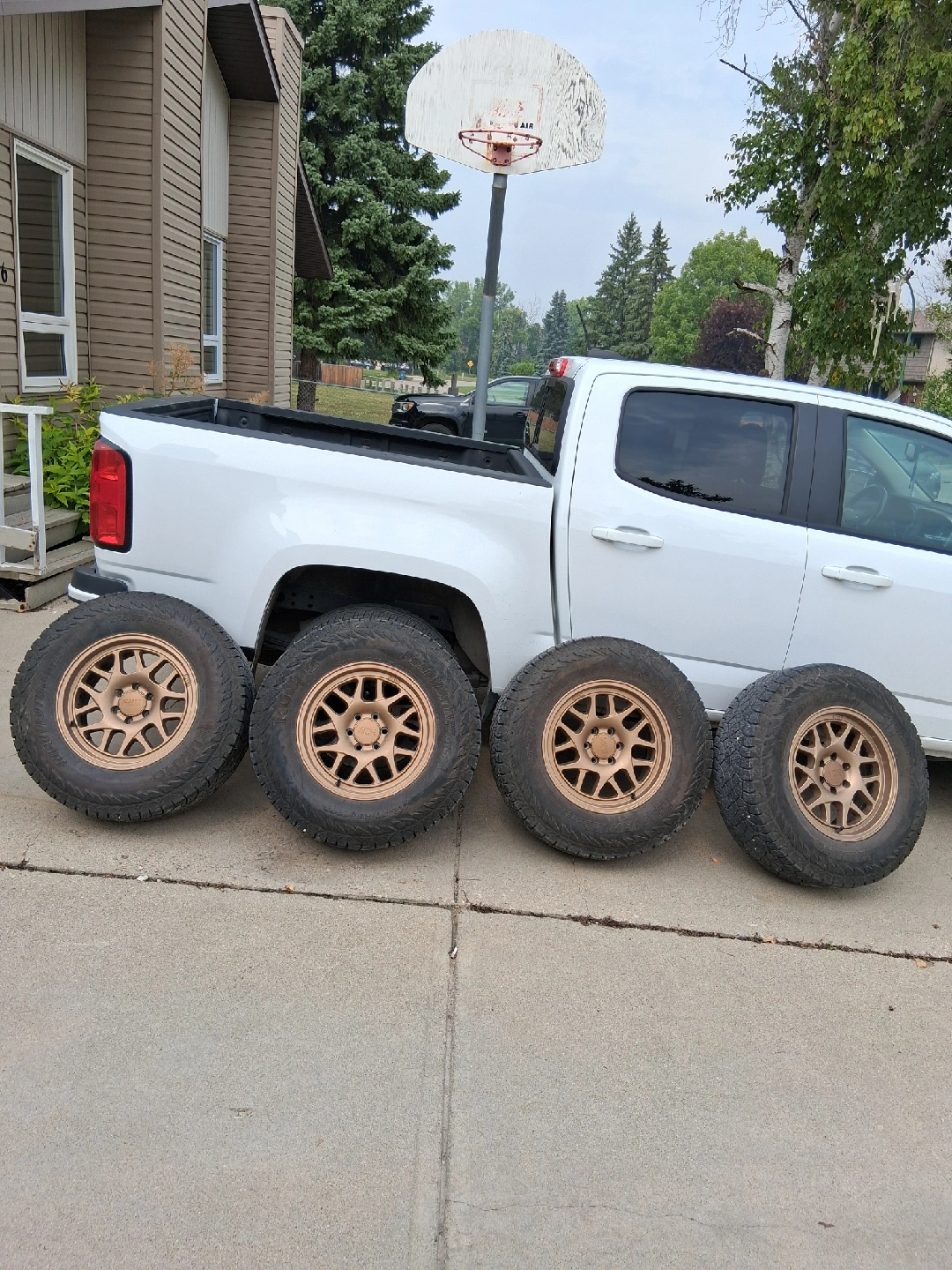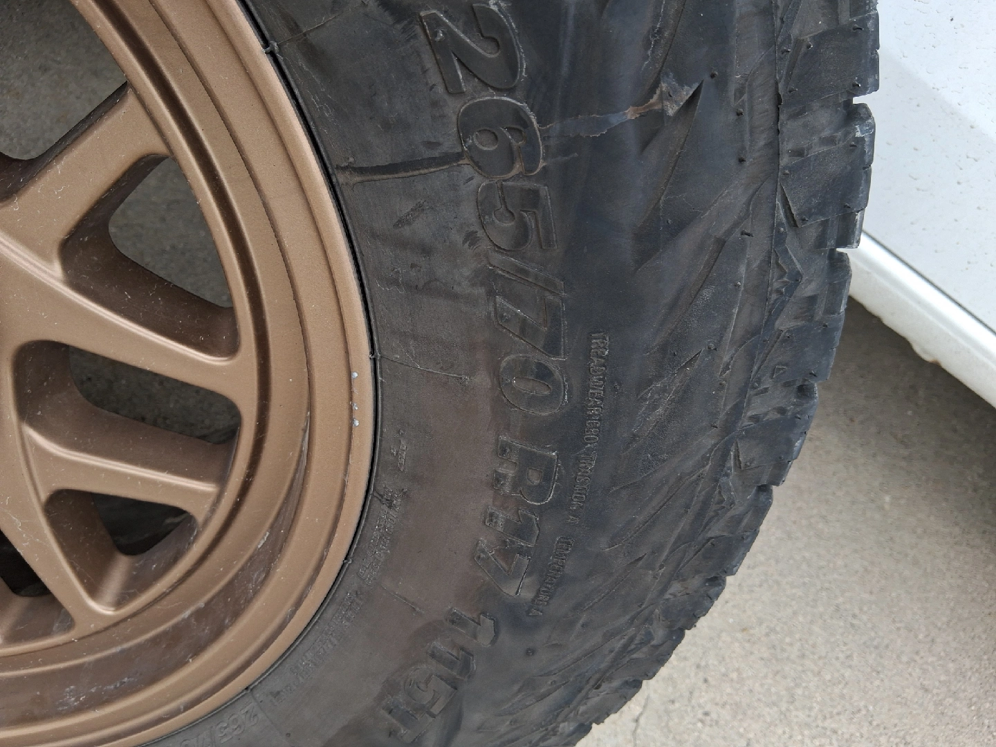 Selling a set of four wheels and tires. The tires are size 265/70R17 and are mounted on bronze-colored rims. 90% tread on tires have lots life left in them! purchased January 2025 had on my canyon until March 2025 them sitting in garage since.