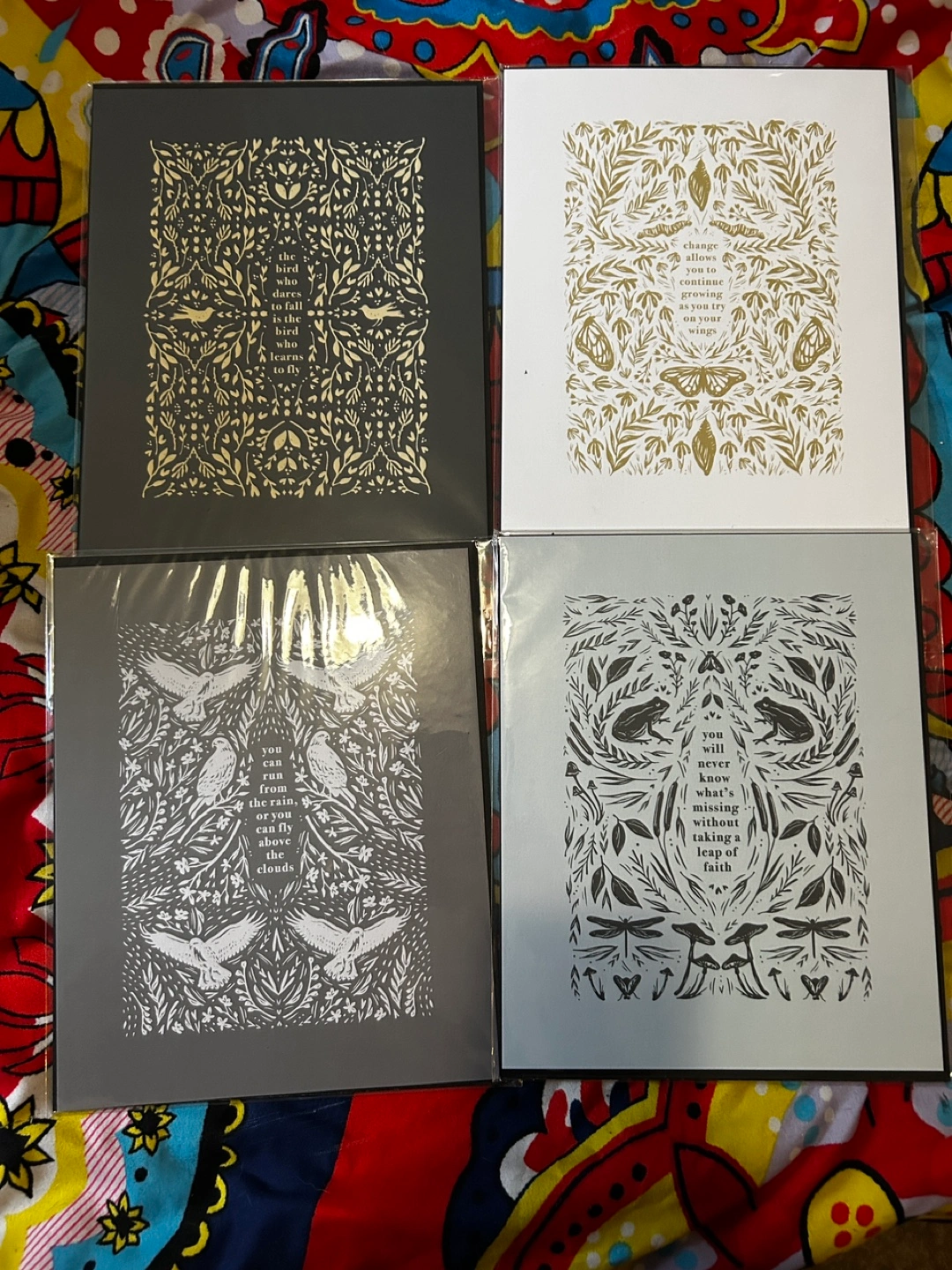 Selling a set of four prints with inspirational quotes and nature-themed designs. They are brand new and ready to add a touch of positivity to your space! 2 sets available