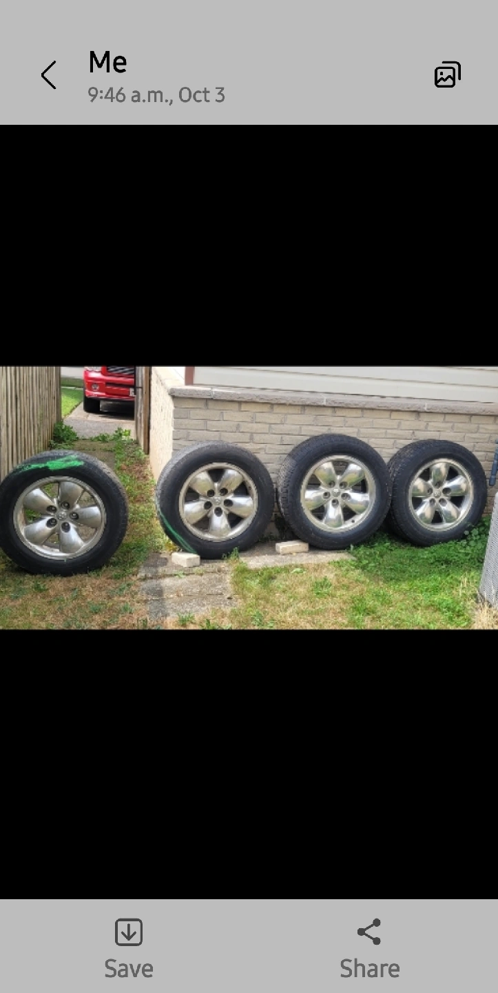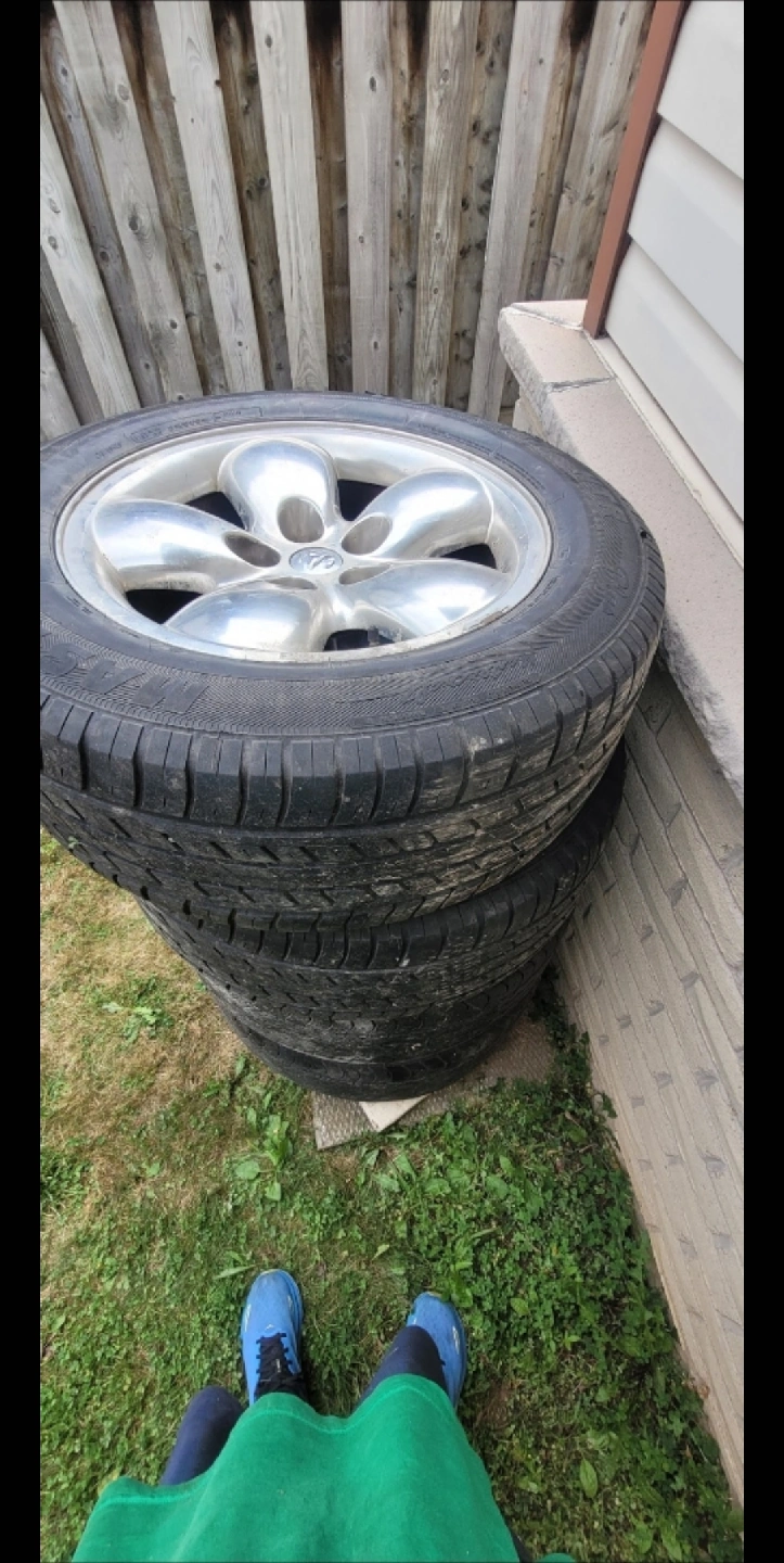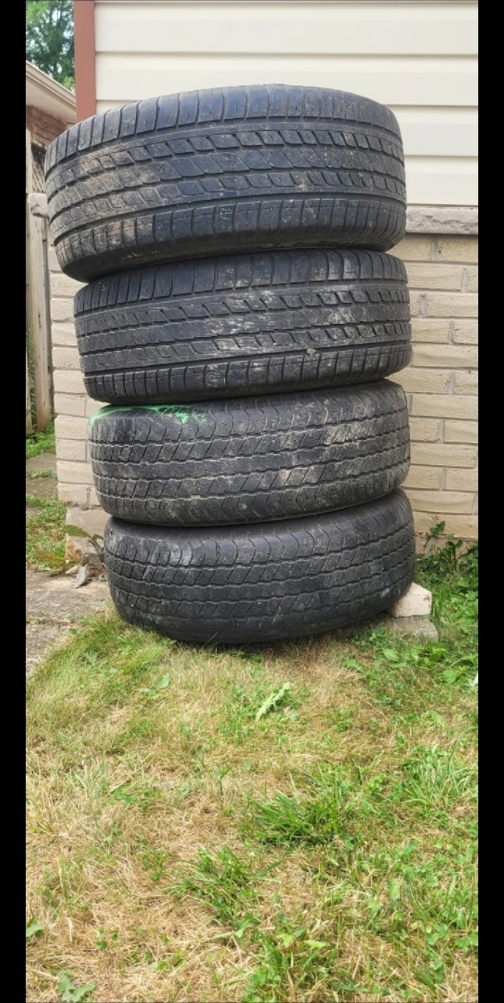 Selling a set of four used tires and rims. 2 are in good condition and 2 are worn out and ready for a new home. Please take a look at the photos and let me know if you have any questions!