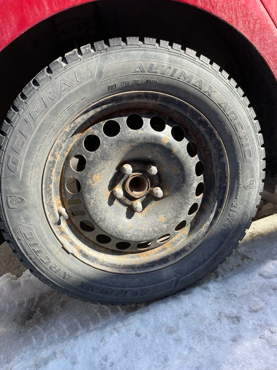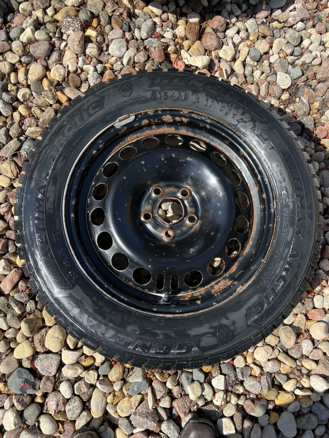 Used winter tire mounted on rim. Good tread depth remaining. Size: 215/60R16 950. General Altimax Arctic. Standard load.