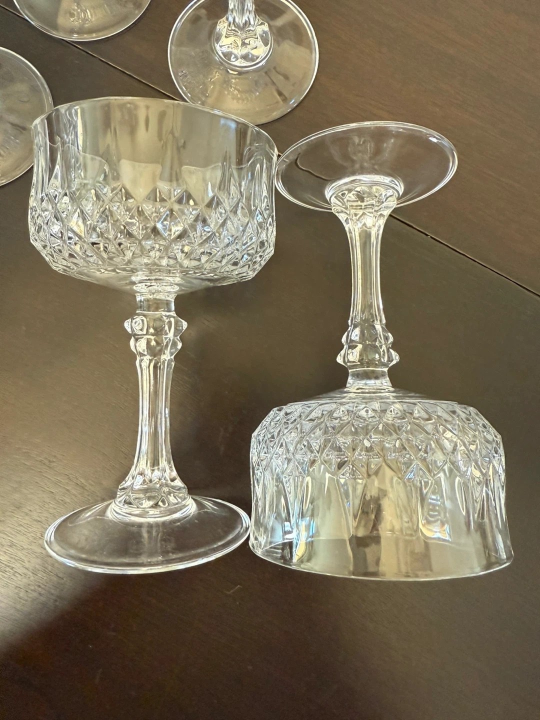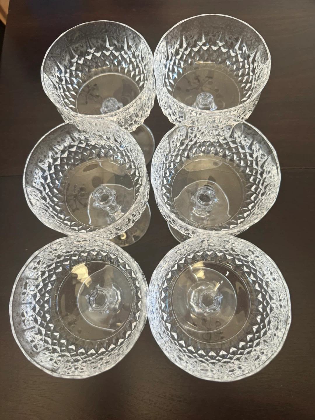 Selling a set of 6 crystal dessert/champagne glasses. They feature a beautiful diamond pattern and are perfect for serving desserts or appetizers. They are in great condition and ready for a new home!