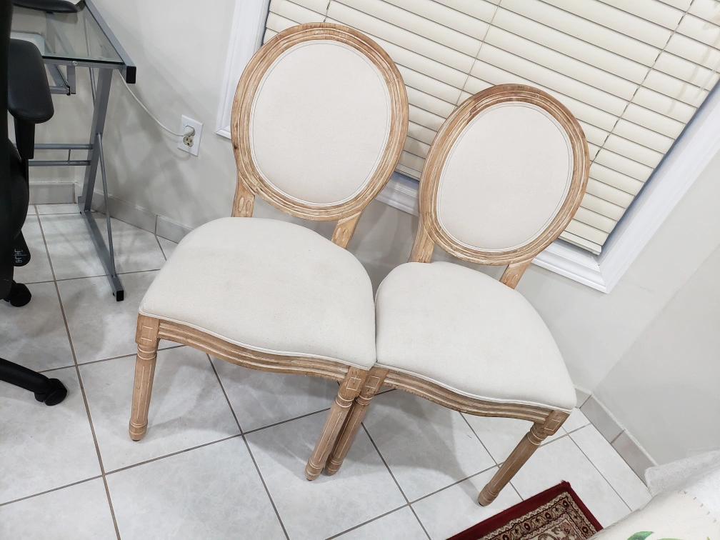 Selling a set of two Louis XVI style dining chairs. They feature a classic oval back design and neutral-toned upholstery that would complement any dining space. The chairs are in great condition and ready to be enjoyed in your home $150 each.