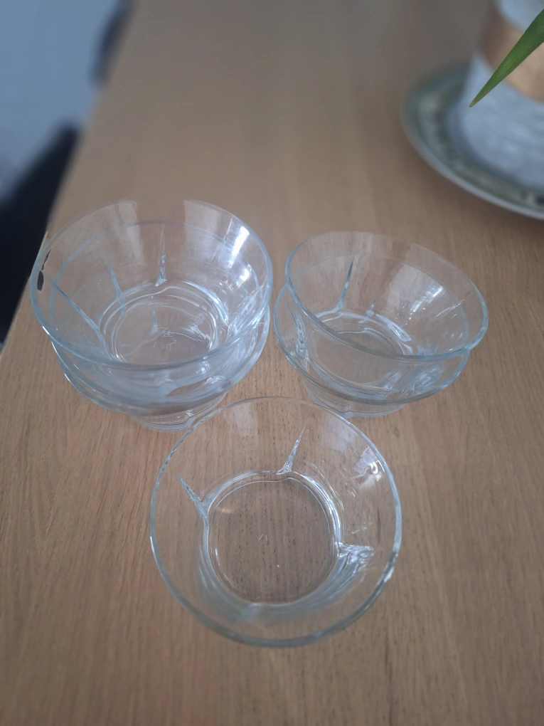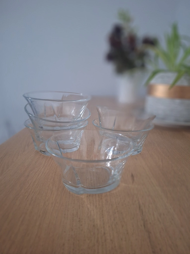 I'm selling a set of six small glass bowls! They are in great condition and perfect for serving snacks or desserts. They'd also be great for mise en place while cooking or baking