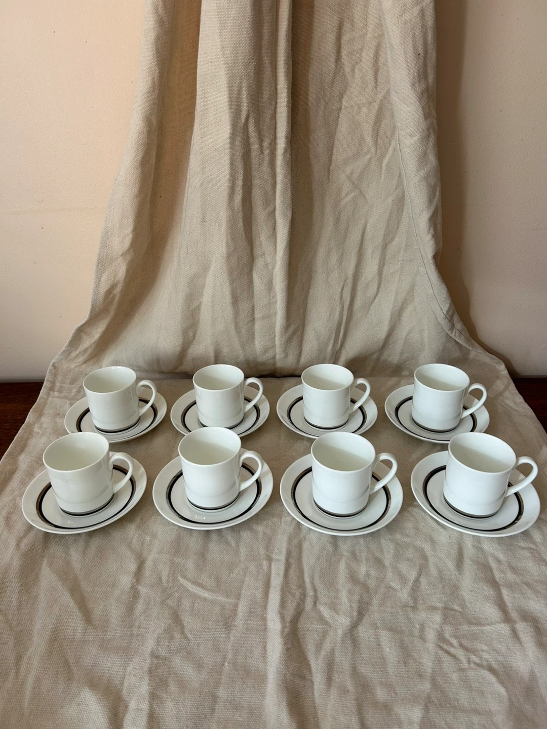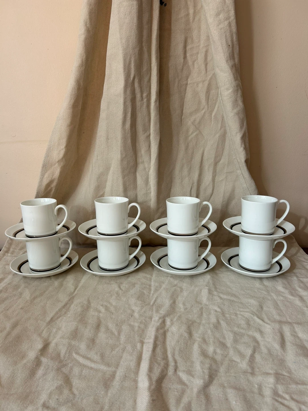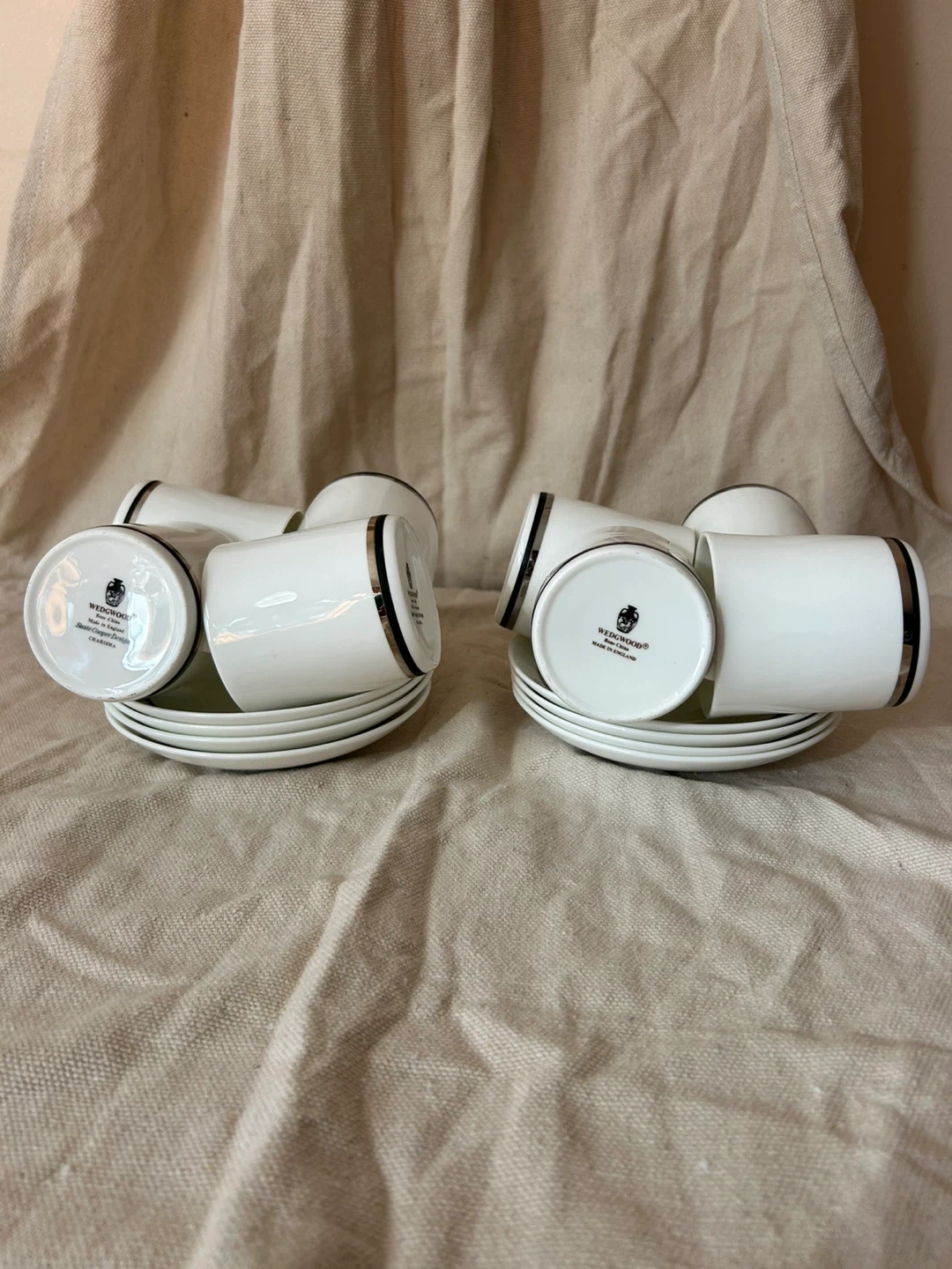 Selling a set of 8 Wedgwood white coffee cups and saucers. They're in great condition and ready for a new home! Perfect for everyday use or entertaining guests