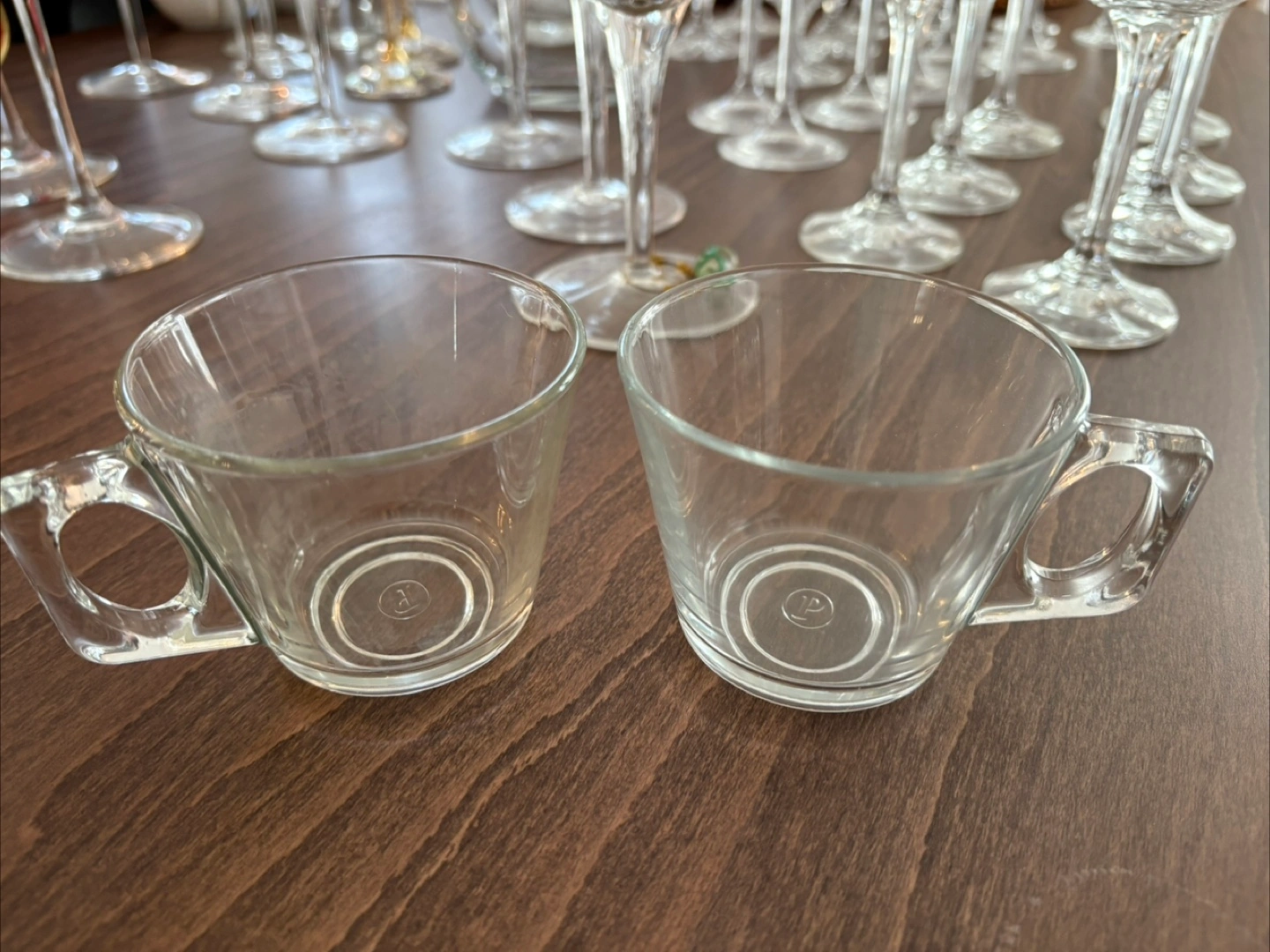 Pair of small, clear glass espresso cups. Simple design, slightly tapered shape. Each cup features a small circular marking at the base.
