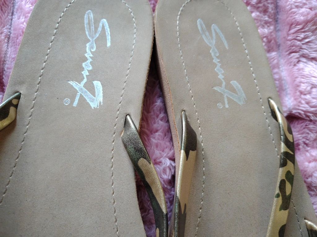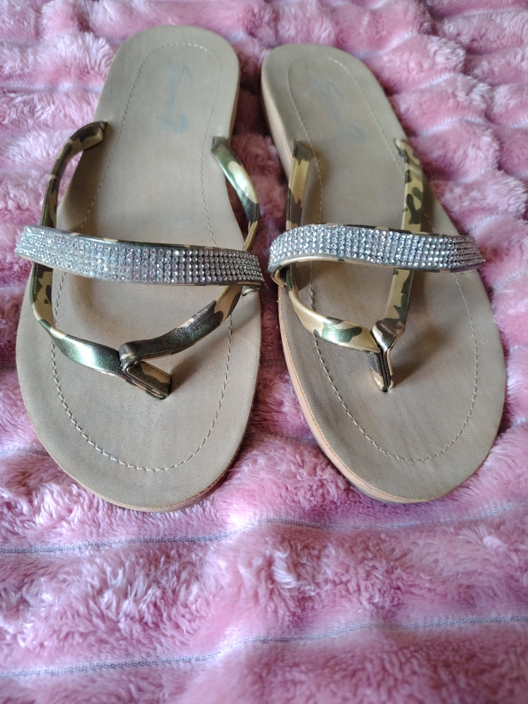 Seven brand ladies flips shoe, size 11. Band across top is all rhinestones and the foot flip straps are metallic camo. Super cute, and comfortable, in good condition.