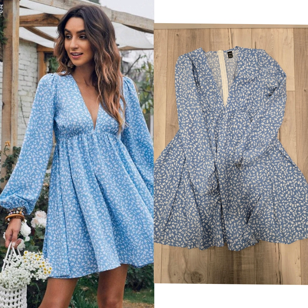 Cute blue mini dress from SHEIN with a white floral pattern. It features a V-neck and long sleeves. Perfect for a casual day out worn once