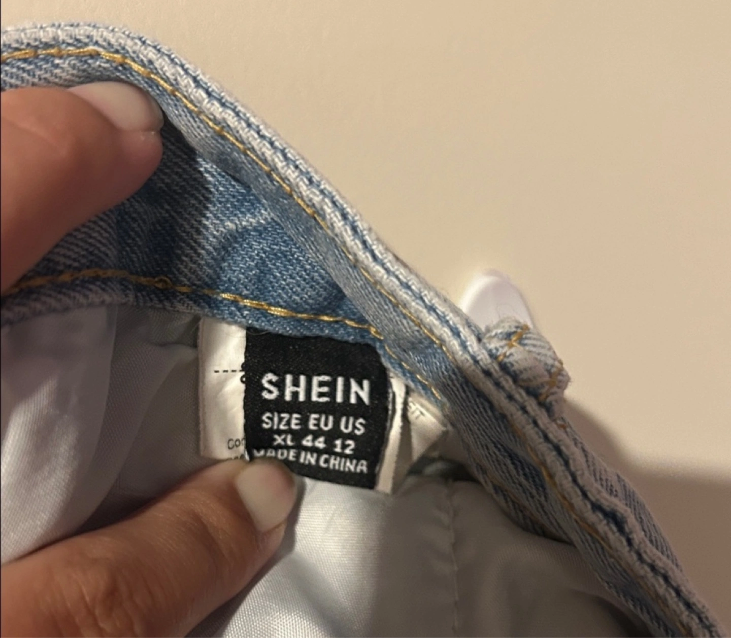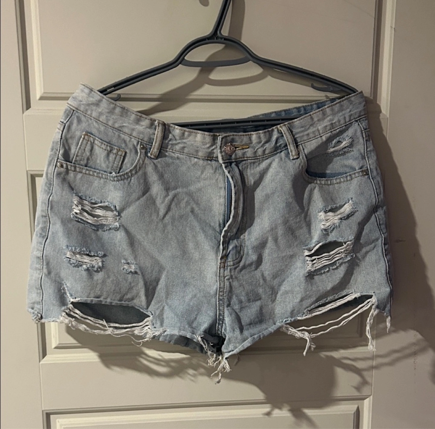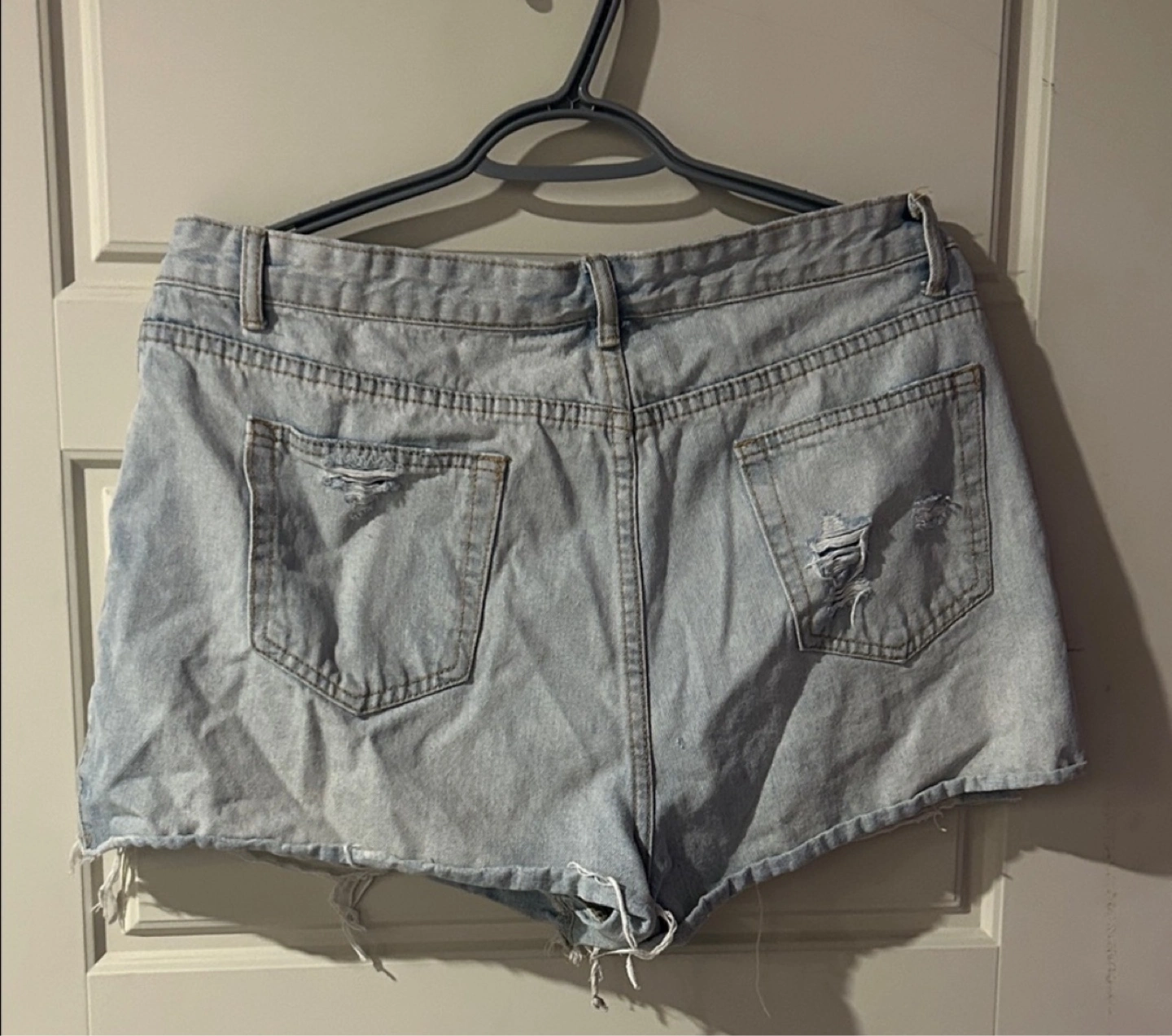 These are a pair of Shein distressed denim shorts. They are a light wash and have a good amount of distressing. The size is XL (EU 44, US 12).
