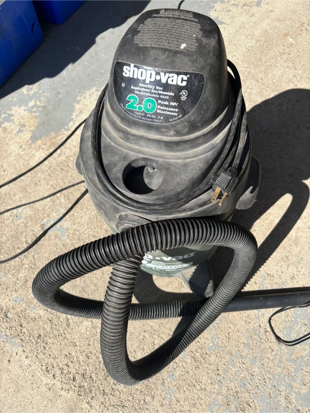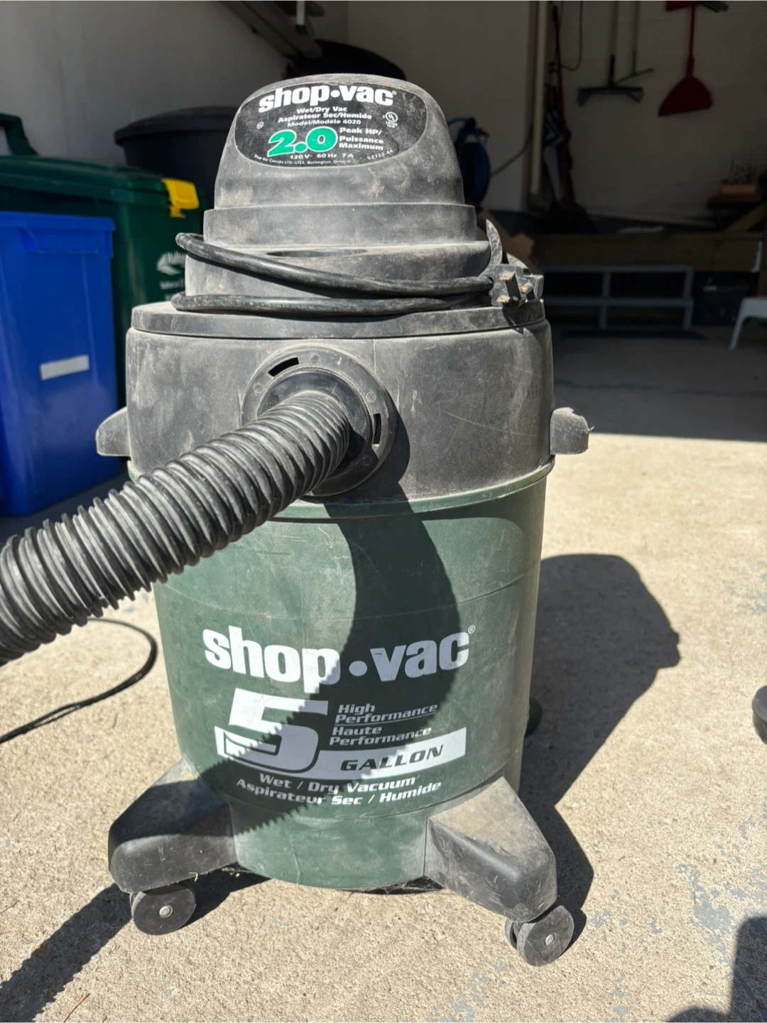 Selling a Shop-Vac wet/dry vacuum cleaner. It's a 5-gallon capacity 2.0 peak HP and in good working condition. Great for cleaning up messes in the garage or around the house!