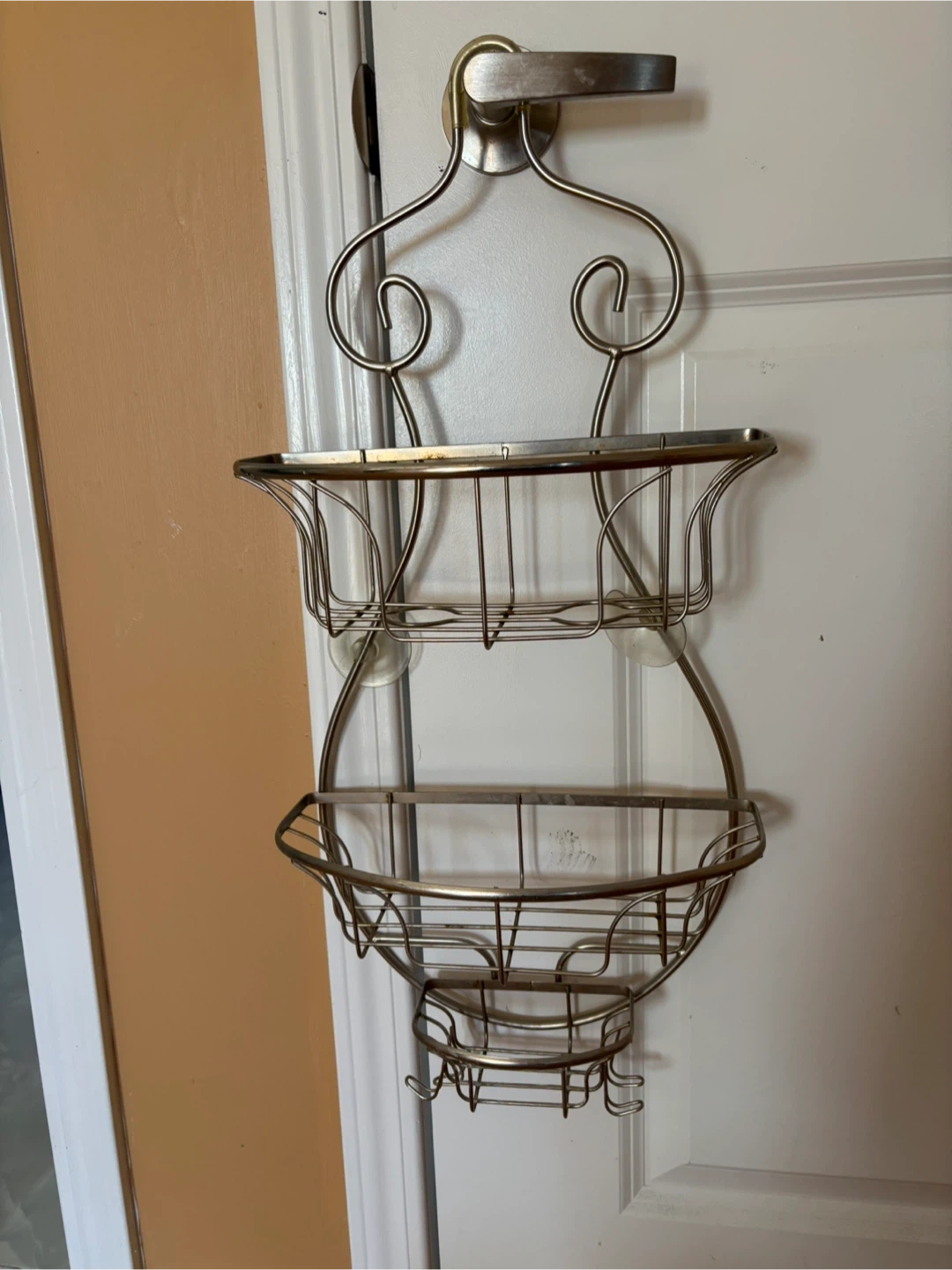 This is shower caddy, perfect for organizing your shower essentials! It features multiple tiers for storing shampoo, conditioner, soap, and more. It easily hangs over most standard doors, making it a great space-saving solution for any bathroom