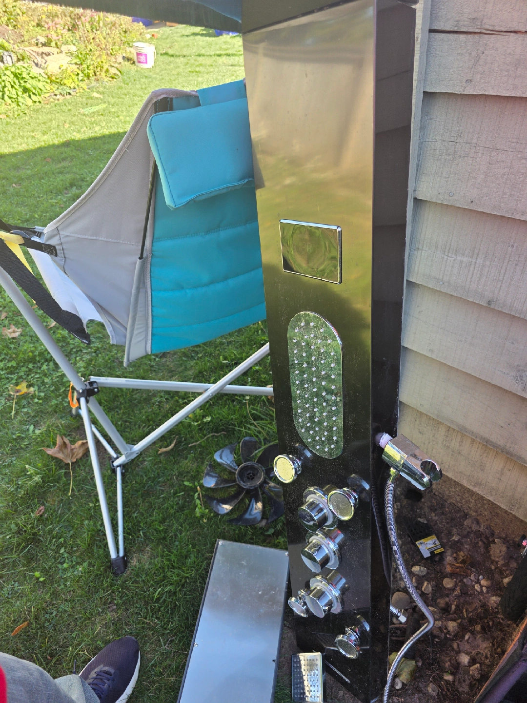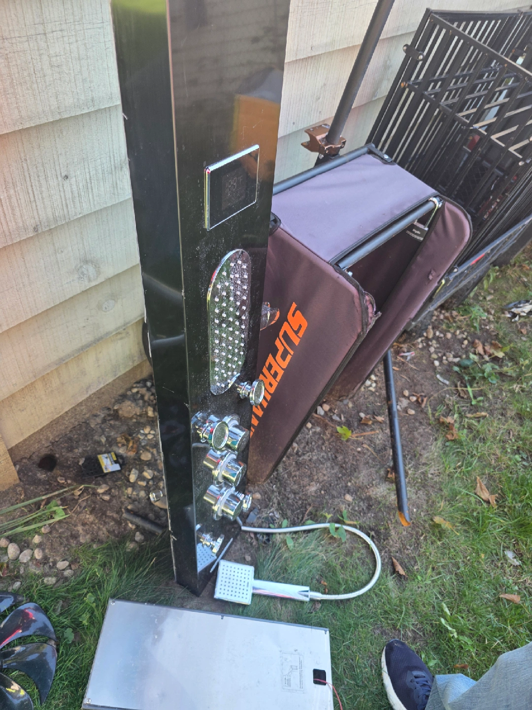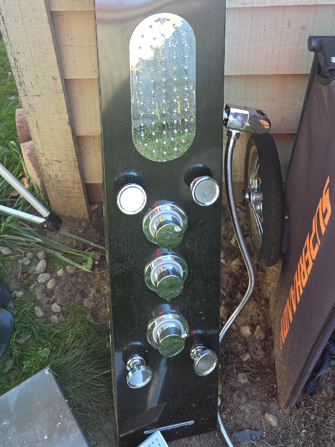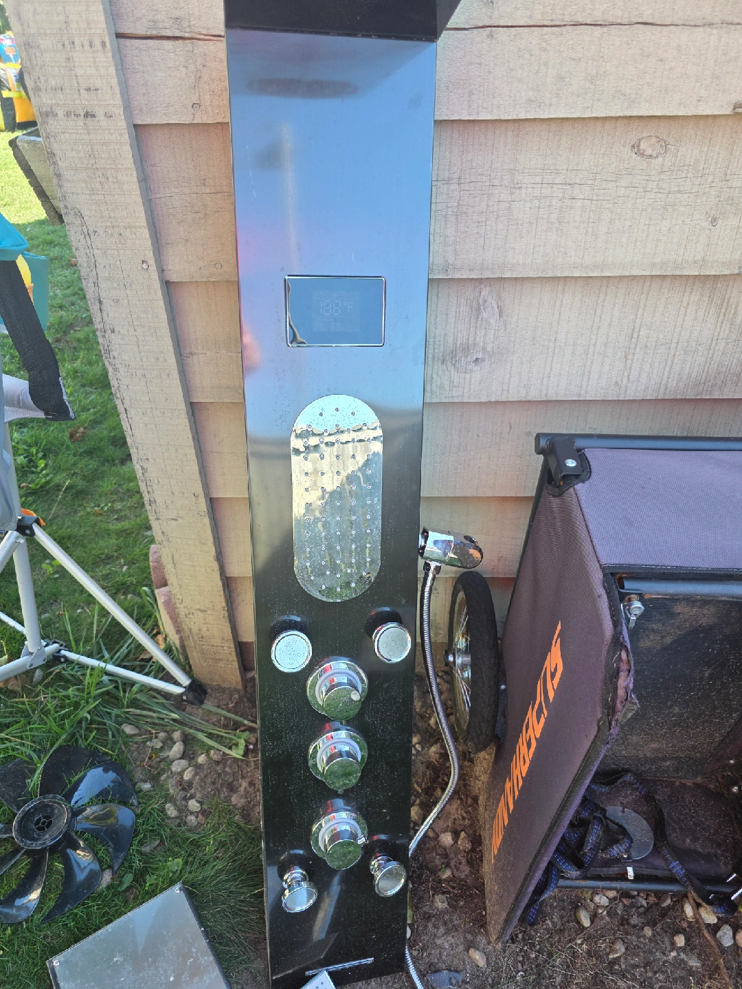 Shower panel system with multiple jets and handheld shower head. It's black with chrome accents and has a digital temperature display