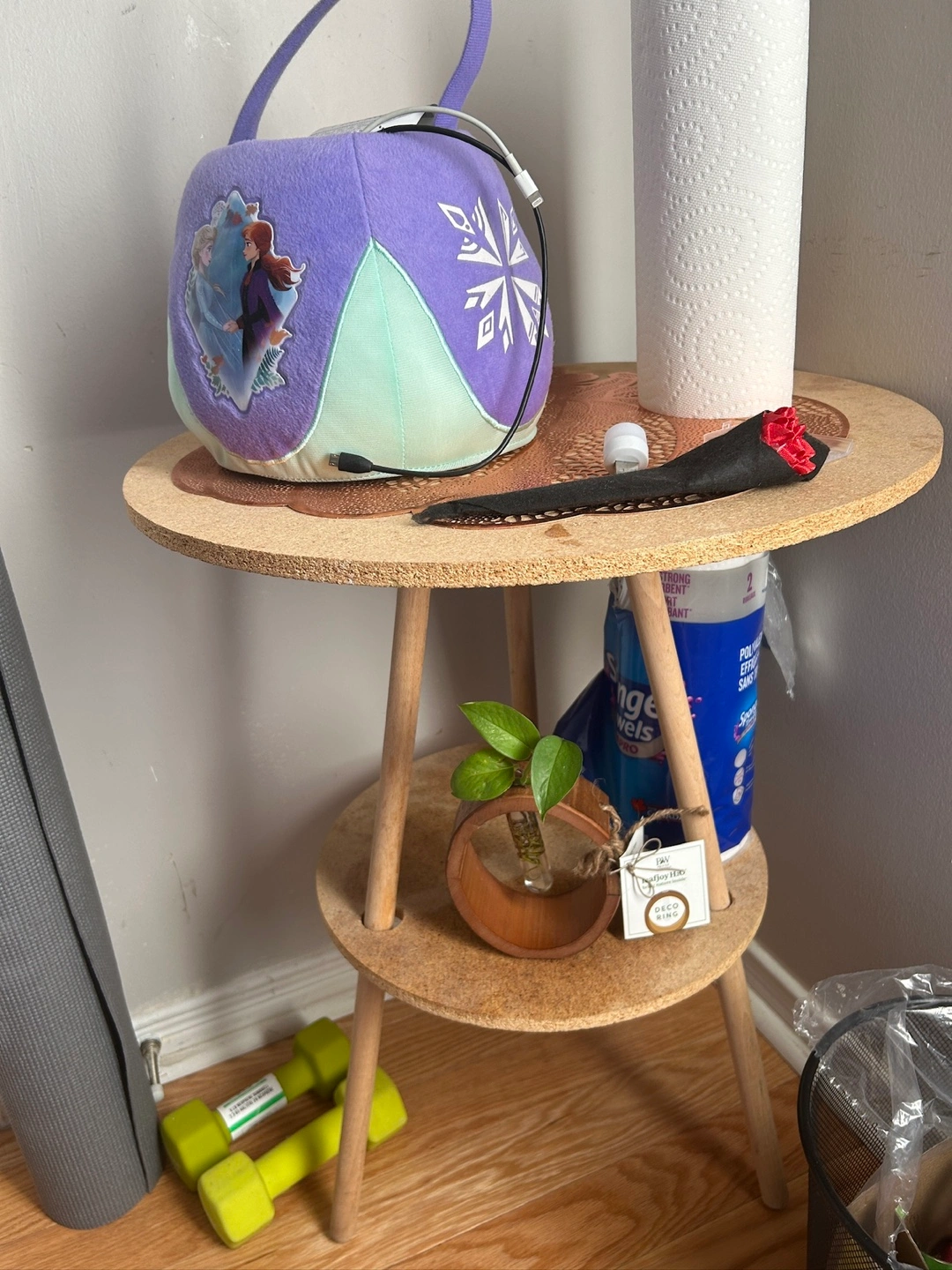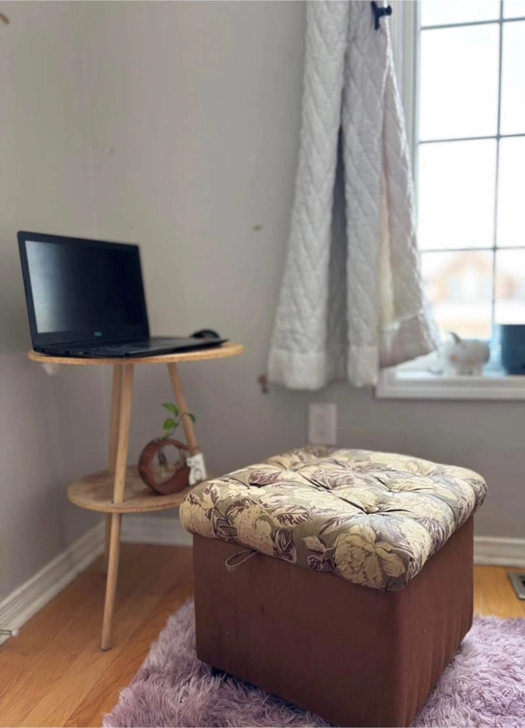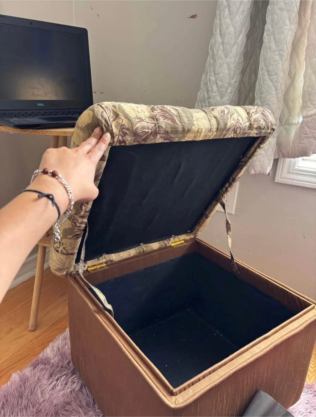 Side table made of wood with a two-tiered design. The storage ottoman has a floral pattern on its lid. Perfect for storing belongings and keeping your living space organized, creating a relaxing atmosphere.