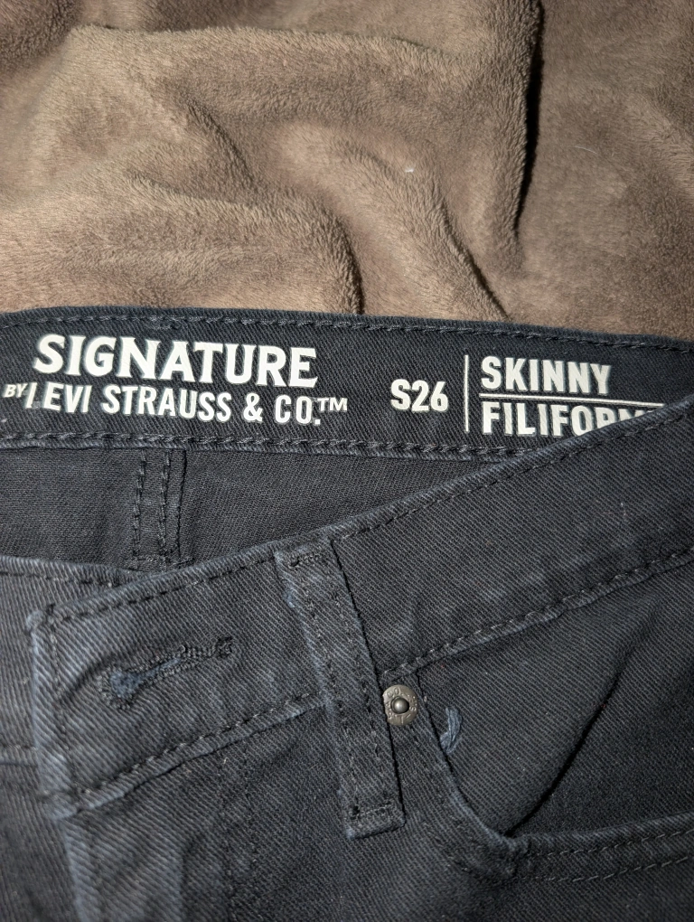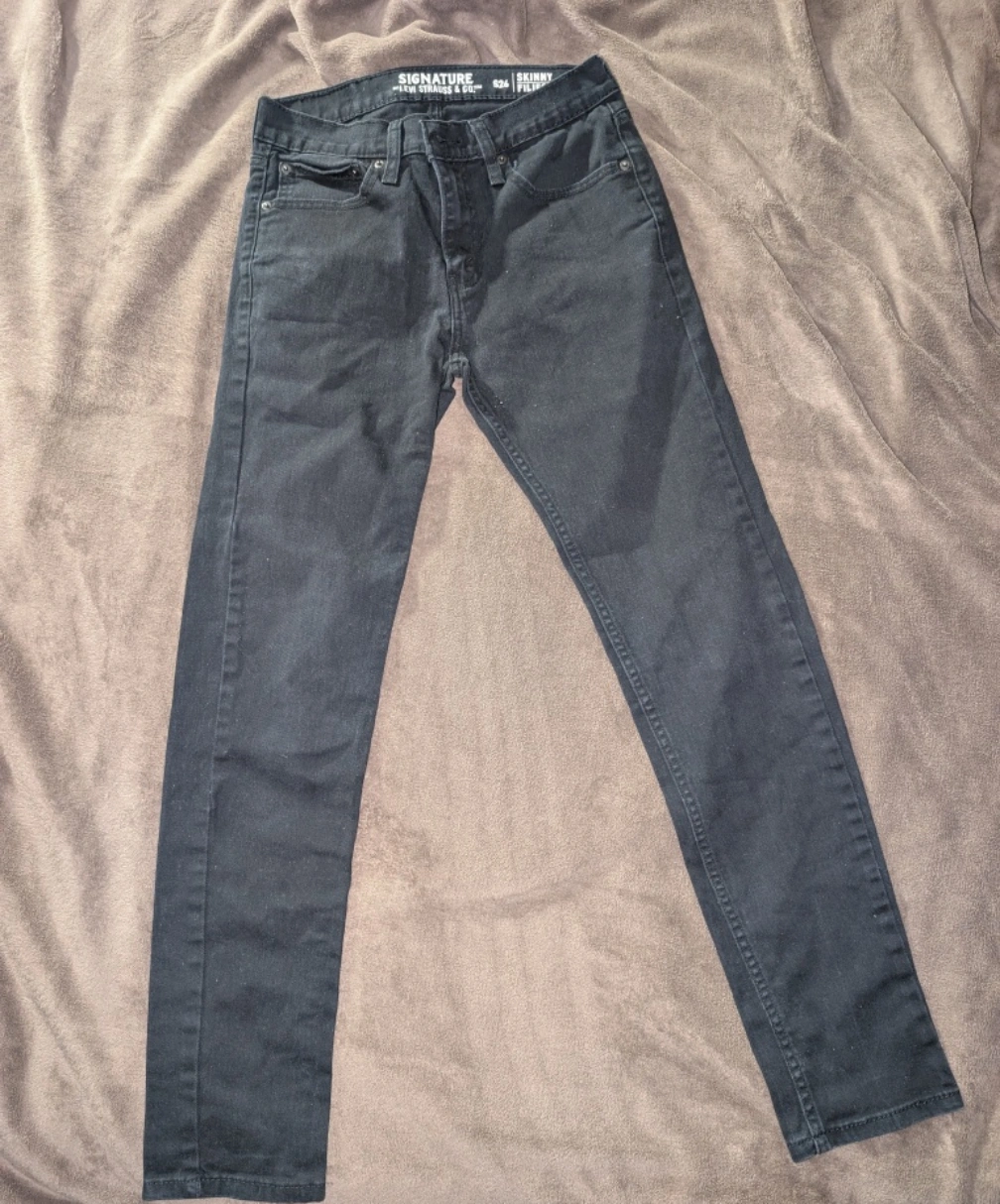Selling a pair of Signature by Levi Strauss & Co. skinny jeans. They're a size S26 and made of 99% cotton and 1% elastane