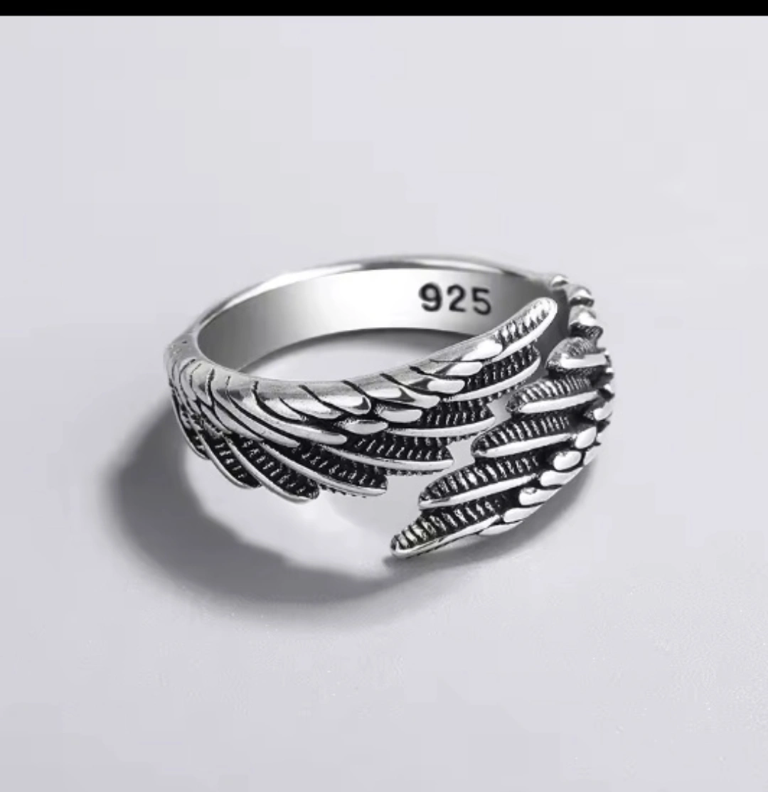 Selling a beautiful silver angel wing ring. It's stamped with '925', indicating it's made of sterling silver. The ring features a detailed angel wing design, perfect for adding a unique touch to your style. For Men and Women.