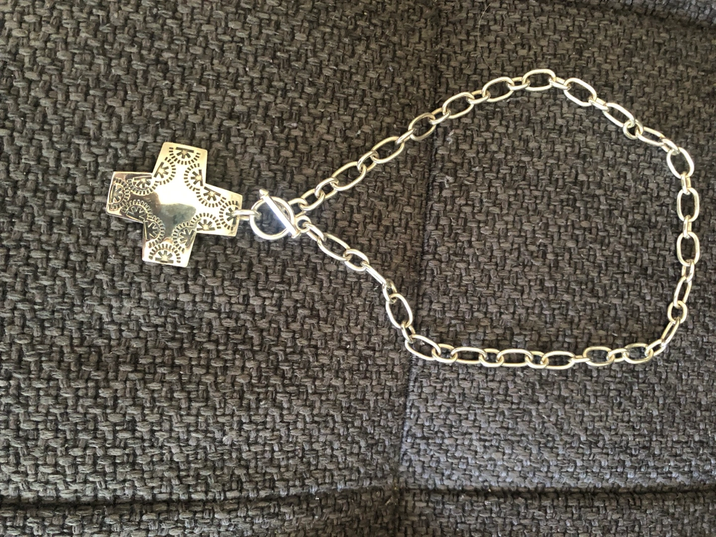 Selling a lovely silver-tone necklace with a cross pendant. It's in great condition and features a unique design on the cross. The chain is a classic link style with a toggle clasp. Perfect for adding a touch of elegance to any outfit