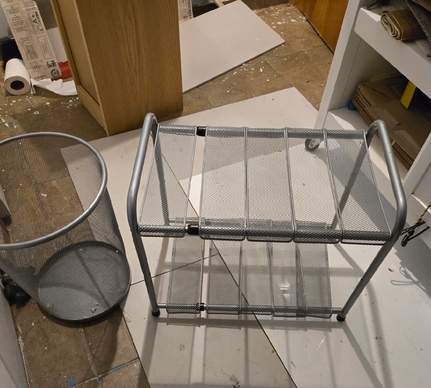 Selling a handy silver mesh shelving unit. It's in good condition and perfect for extra storage. Also included is a matching mesh waste bin, great for keeping things tidy! Shoe rack k measures 18 by 12 by 15 inches height.