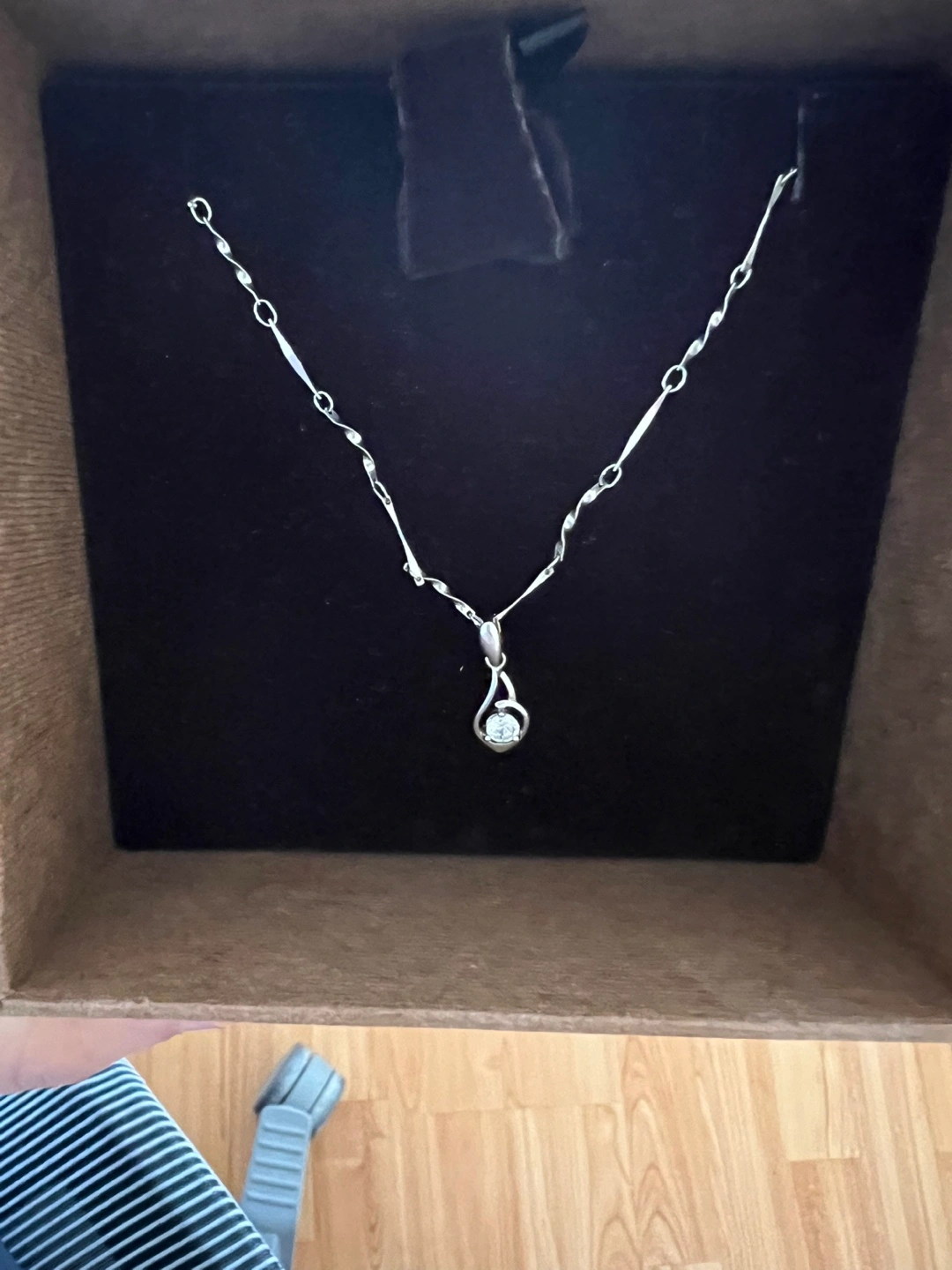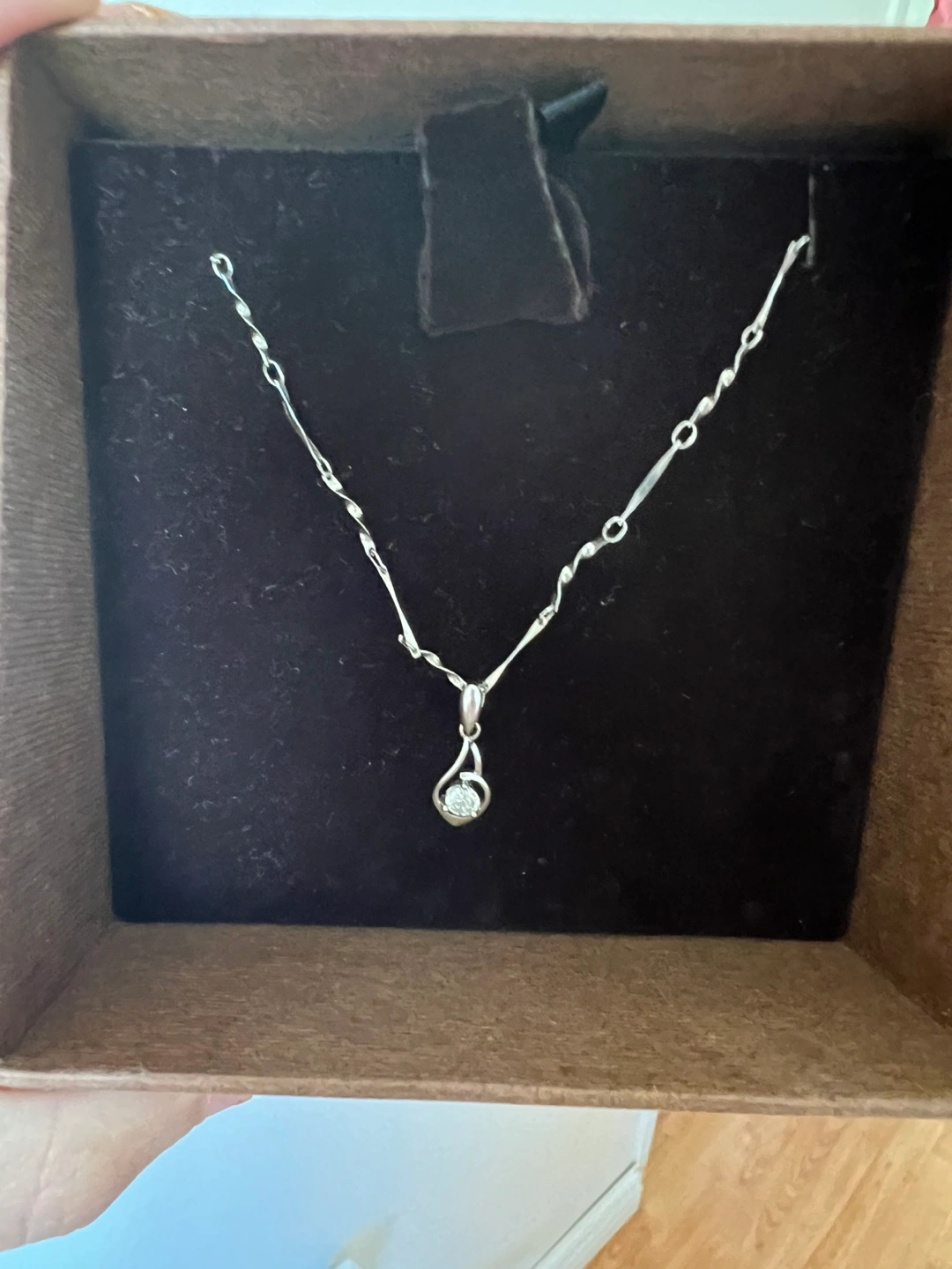Selling a delicate silver necklace featuring a teardrop pendant with a small stone. It comes in its original box, perfect for gifting or safekeeping. The necklace is in great condition and ready to be worn box not included