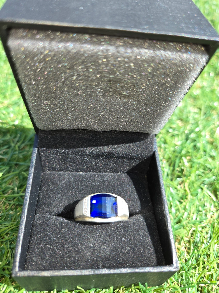 Selling a silver ring featuring a striking blue stone. It comes in its original box and reciept from peoples, making it perfect for gifting or safekeeping. A stylish accessory to add a pop of colour to any outfit!