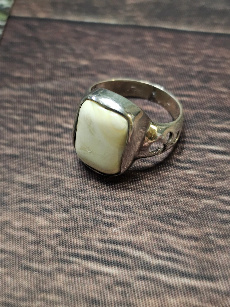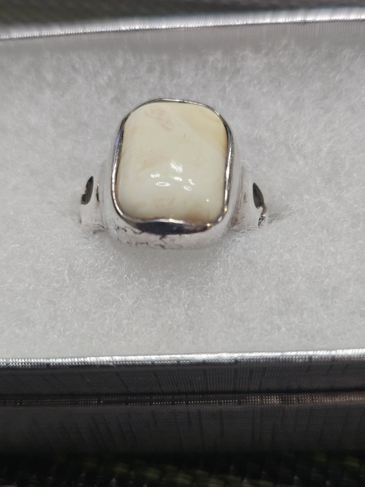 Selling a silver ring with a smooth, white stone stamped 925. It's in great condition and comes in a box for safekeeping! It's a unique piece that would make a great addition to any jewelry collection