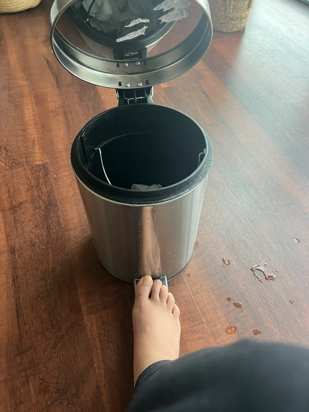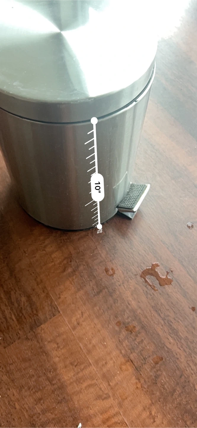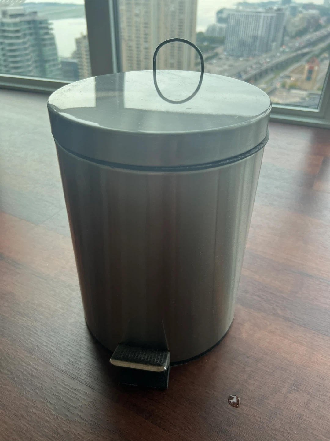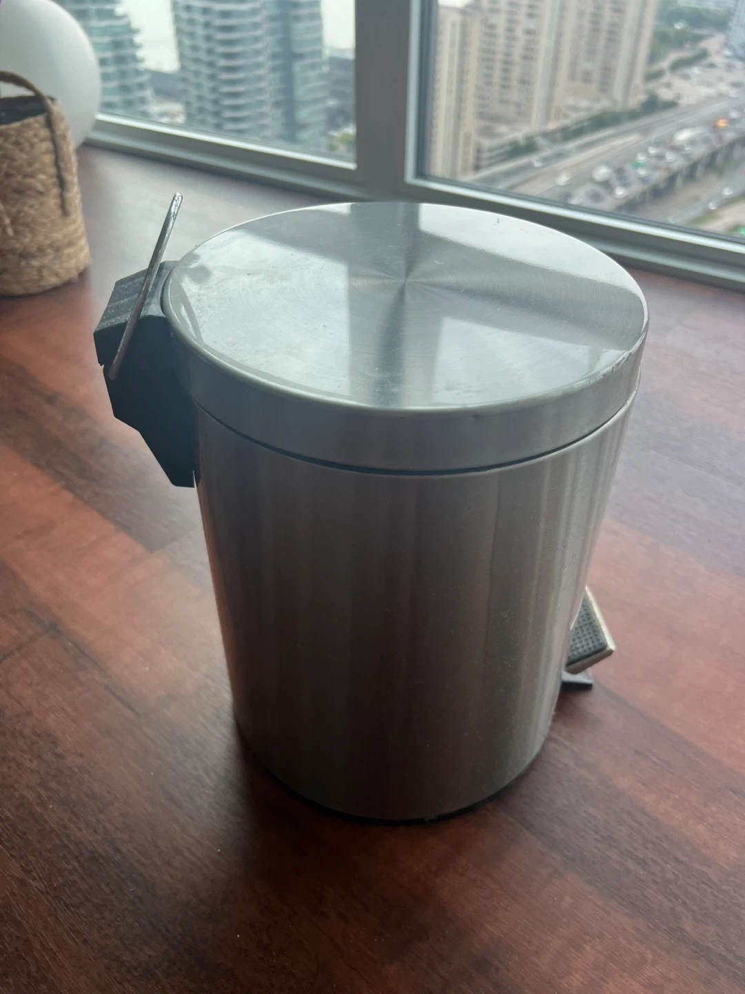Selling a used silver step-on trash can. It's about 10 inches in height and perfect for small spaces