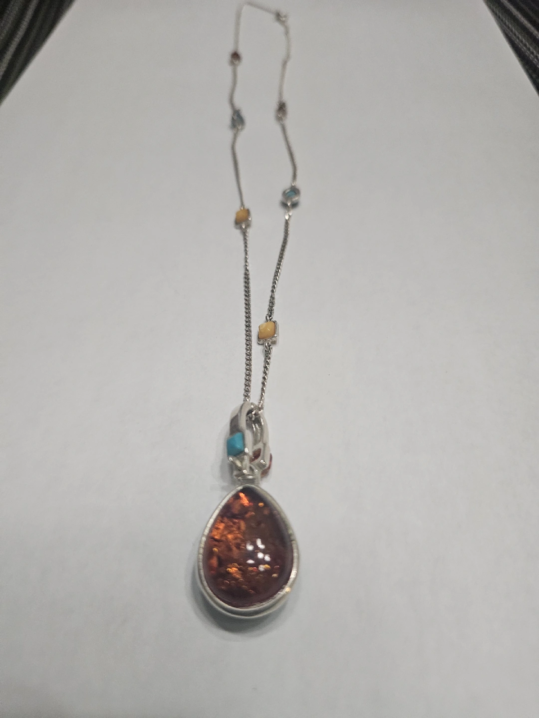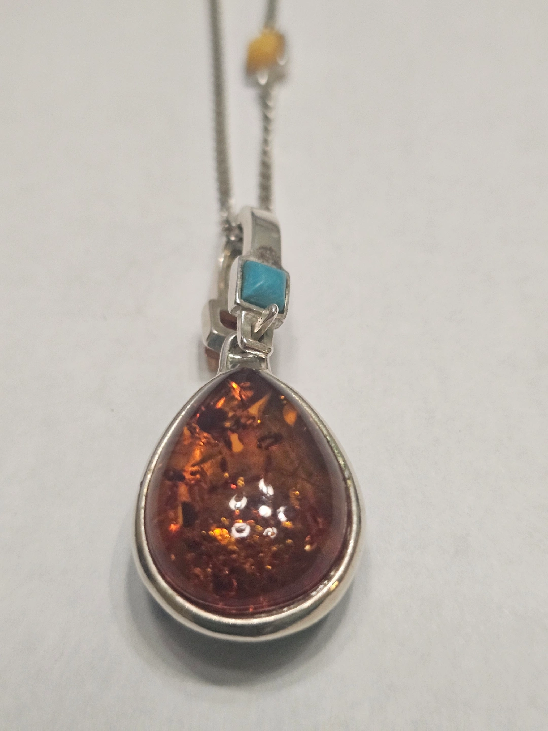 Silver Tone Necklace with Turquoise & Amber Pendants
