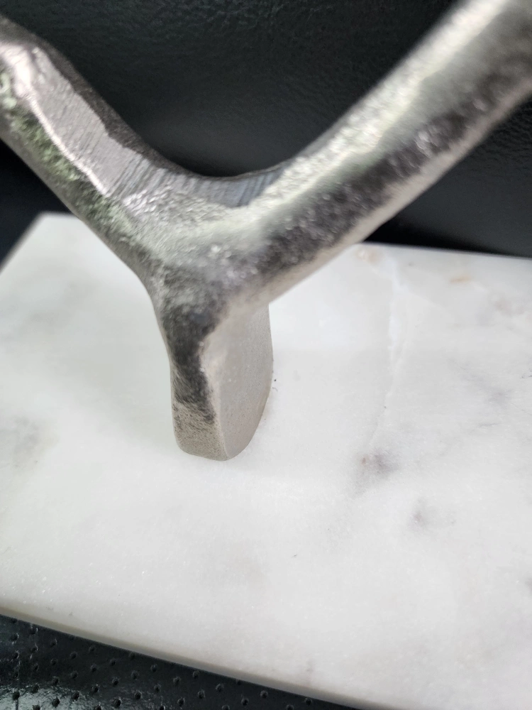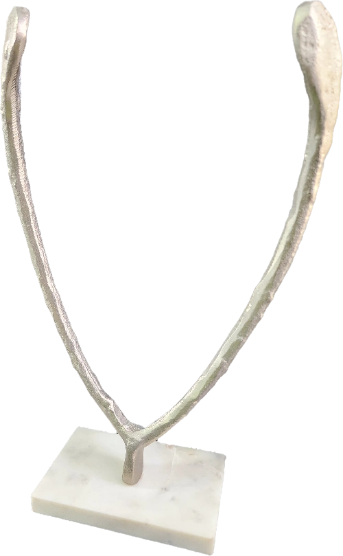 Here's a lovely silver-toned wishbone sculpture mounted on a marble base! It would make a great addition to any room as a decorative piece. It's in great condition and ready for a new home