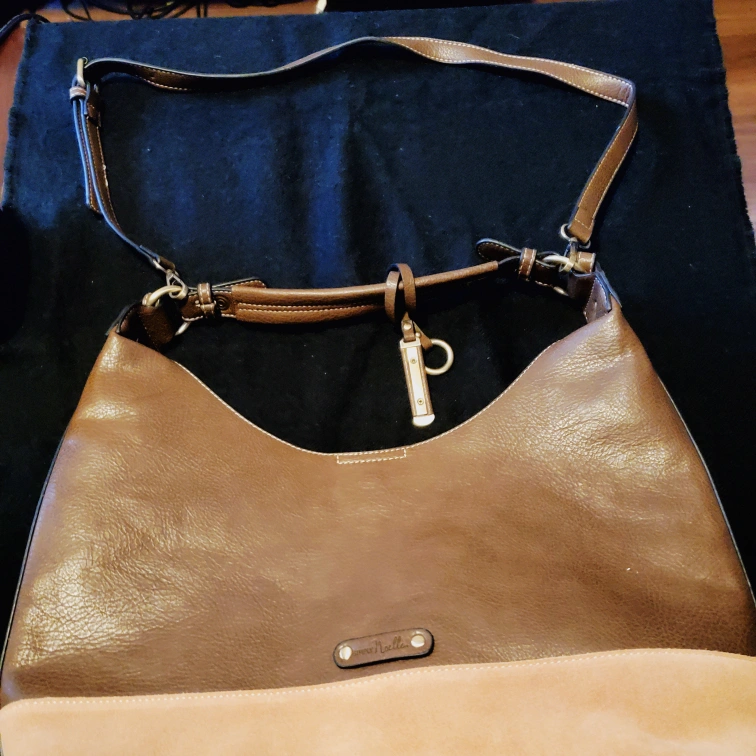 Brown leather and suede shoulder bag. Features a crossbody strap and two-toned design. Spacious interior. Gold-toned hardware. Excellent condition.